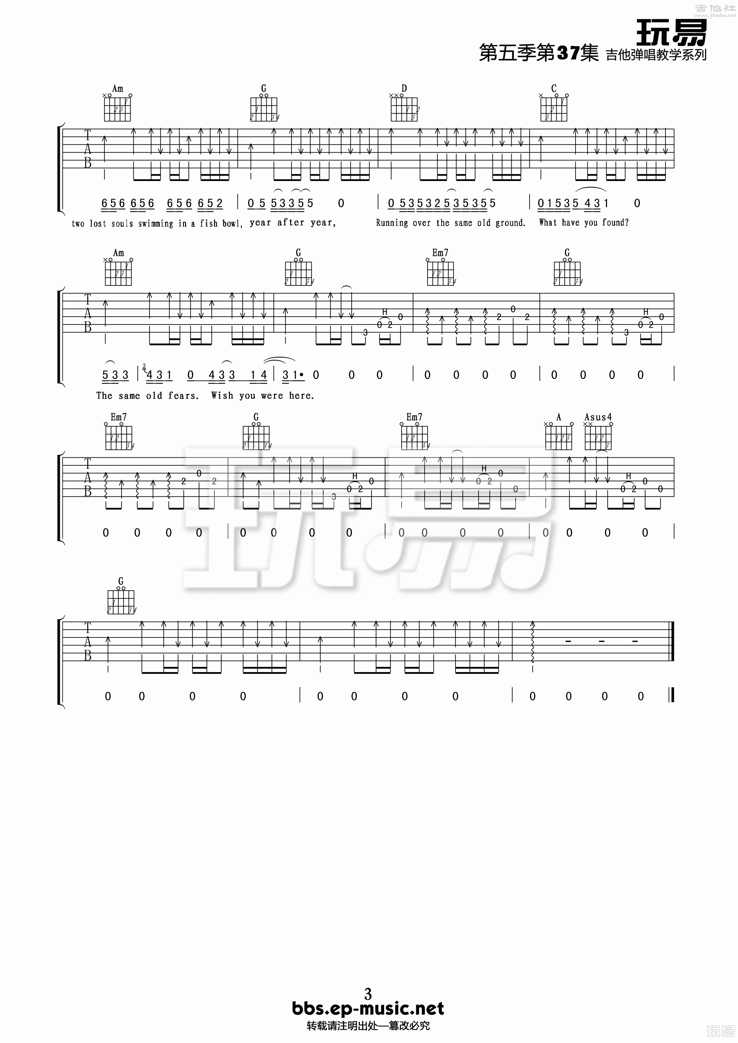 Pink Floyd《Wish you were here》吉他谱,玩易编配出品,共有3张高清图谱。