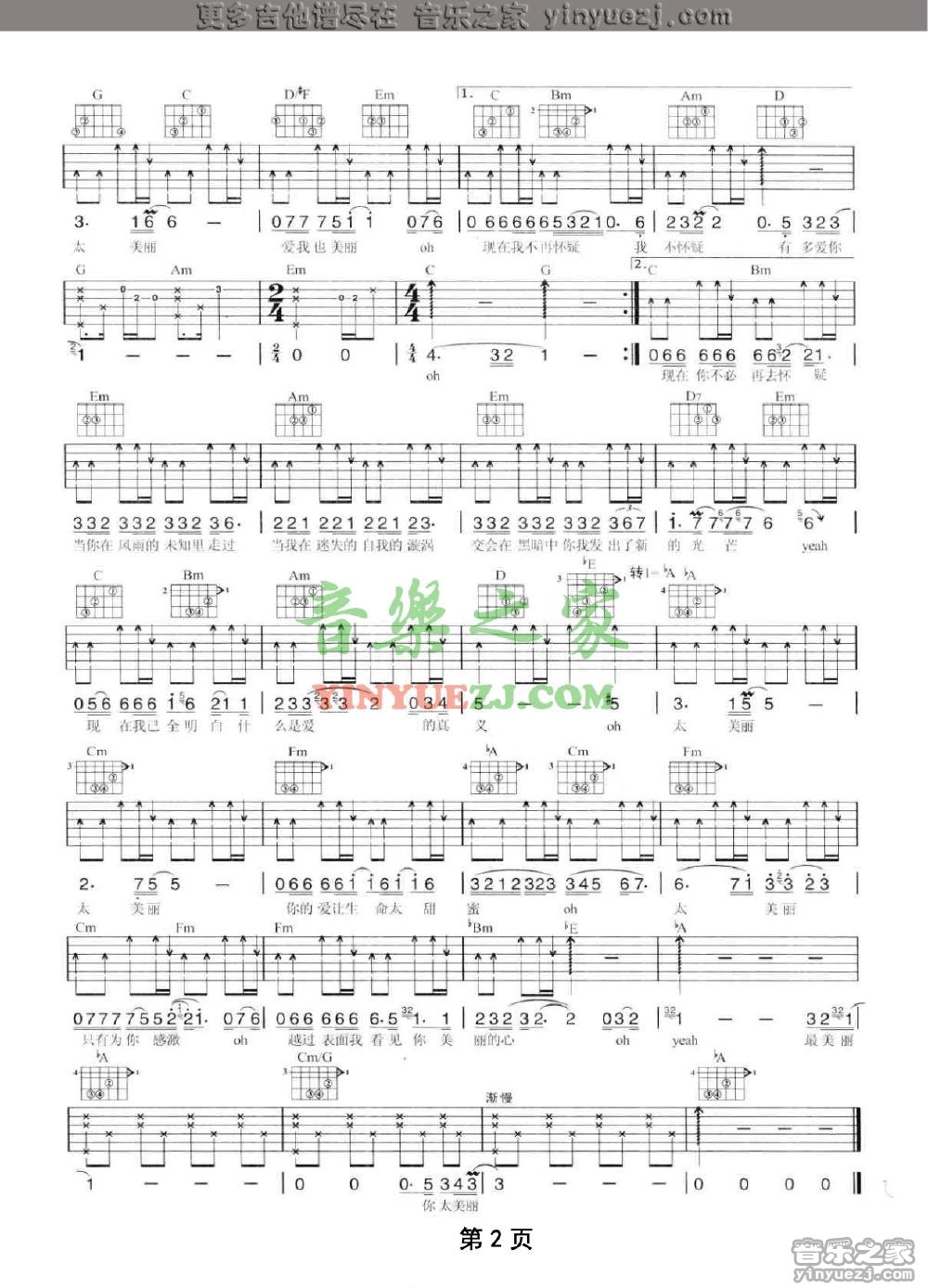 陶喆《太美丽》吉他谱,YYZJ编配出品,共有2张高清图谱,免翻页排版设计。