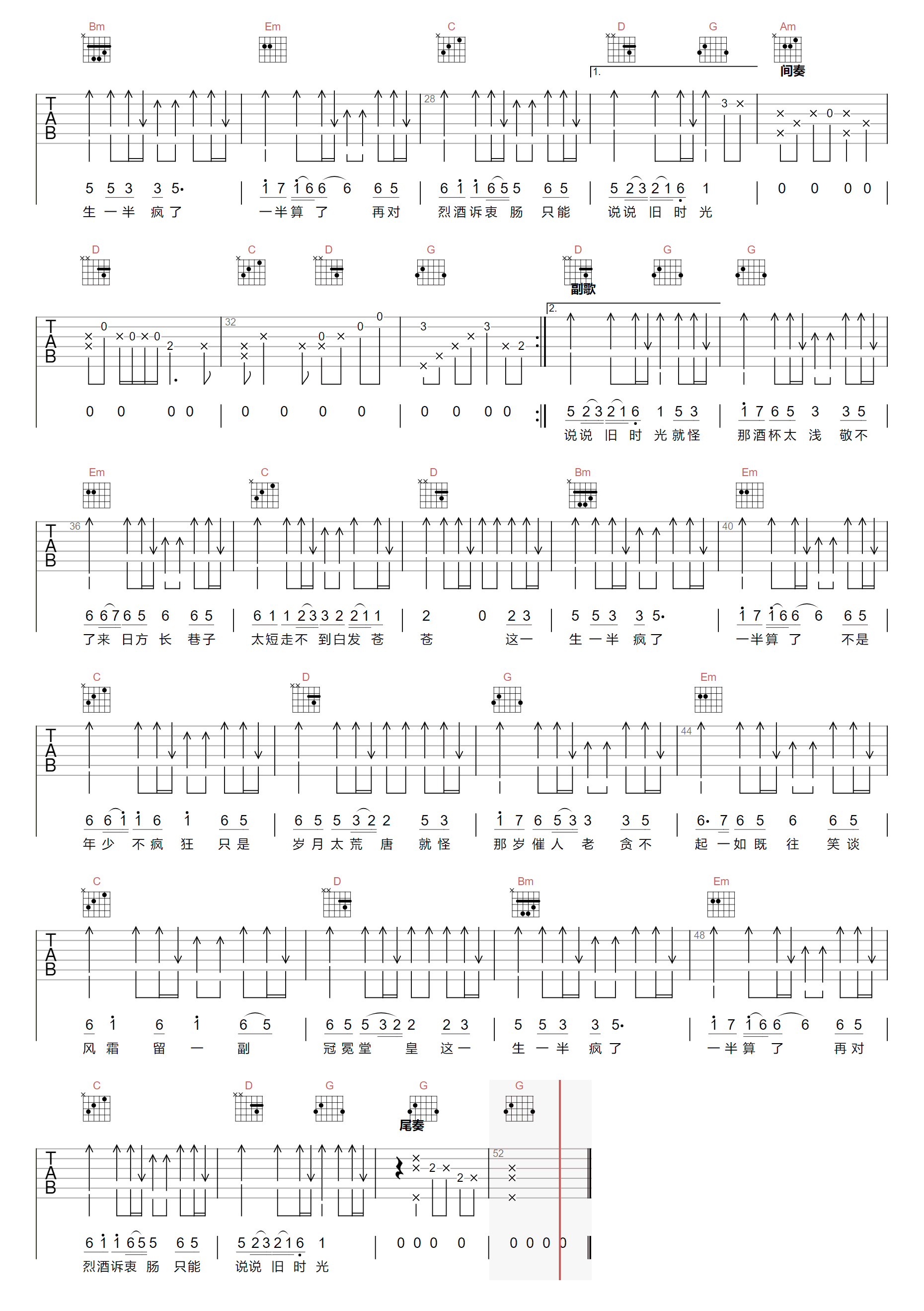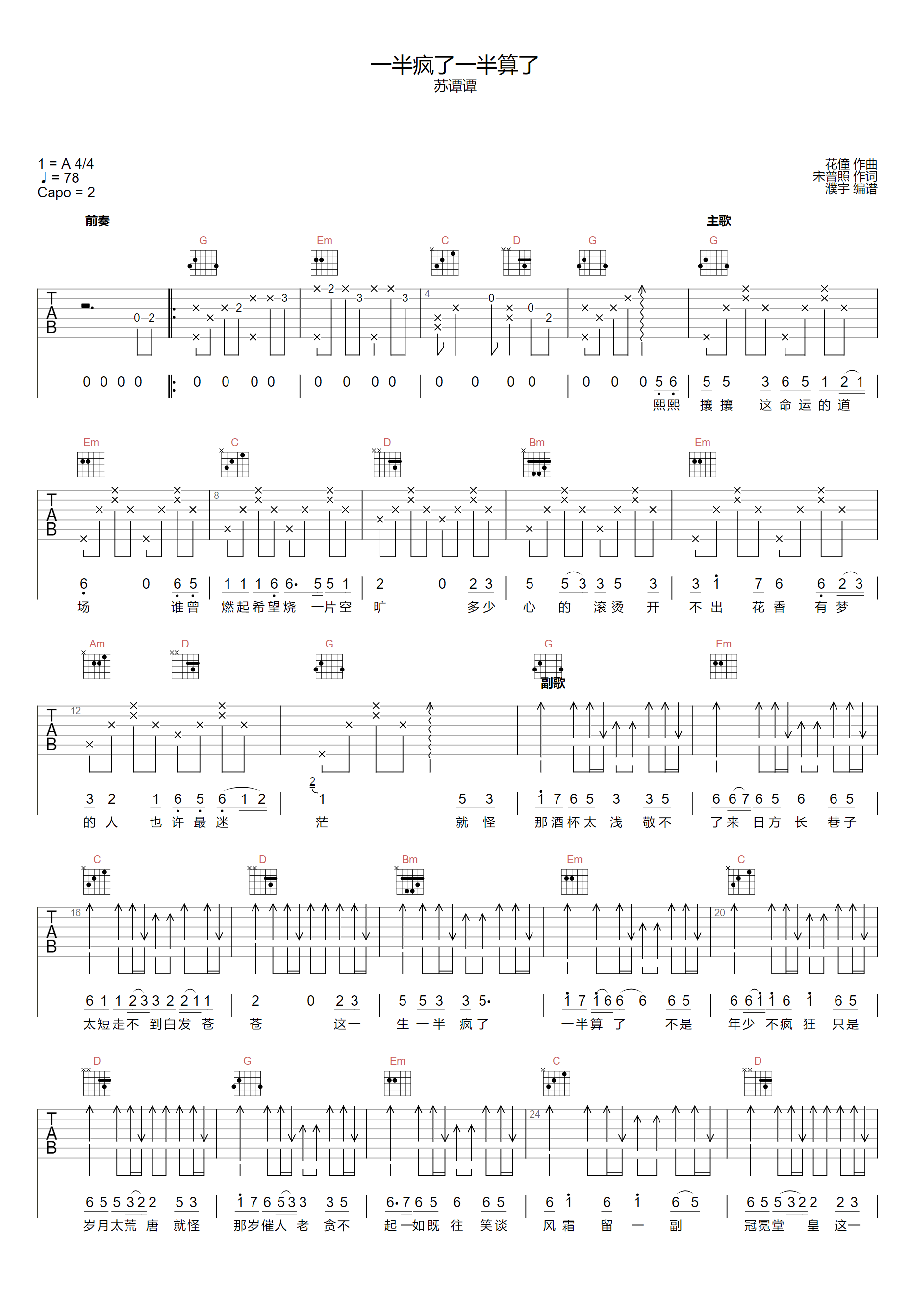 苏谭谭《一半疯了一半算了》吉他谱,采用G调指法编配,共有2张高清图谱,免翻页排版设计。一半疯了一半算了吉他谱,苏谭谭的一首网络热门歌曲。普照的现实主义的白描歌词,苏谭谭的烟嗓演唱诠释,道尽了红尘道场的无奈与沧桑。《一半疯了一半算了》吉他弹唱谱,原调A,采用G调和弦指法编配,变调夹CAPO夹二品,高清图片谱共两张六线谱,感谢@濮宇编配制谱,曲谱宝曲谱更新上传。 一半疯了,一半算了,人的一生匆匆忙忙的来,匆匆忙忙的去,没有走到最后的都是过客,珍惜一直留在身边的人。高启强都说了,风浪越大,鱼越贵,大风大浪是大海,有哭有笑才是人生。