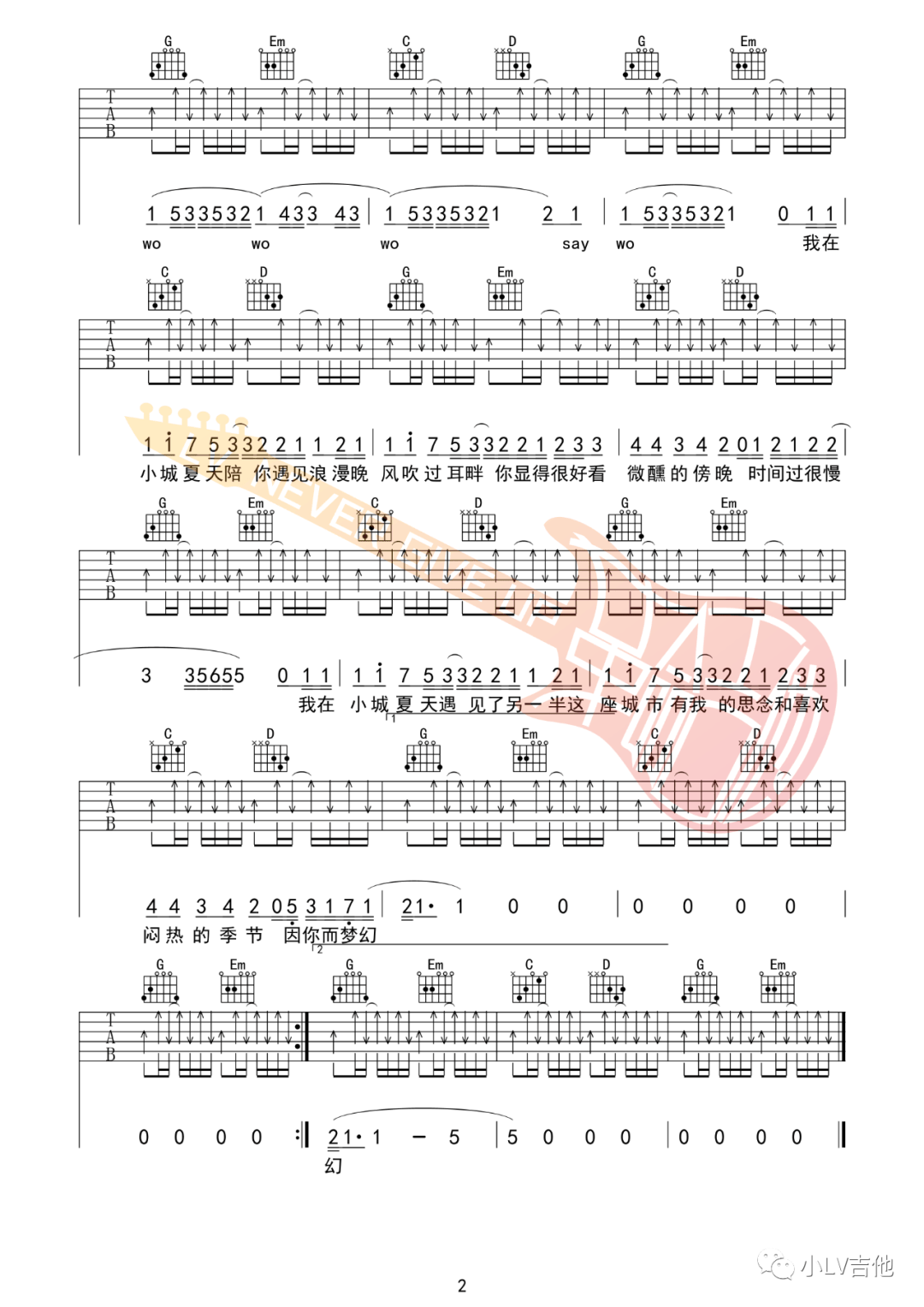 LBI利比《小城夏天》吉他谱,革命吉他编配出品,共有2张高清图谱,免翻页排版设计。
