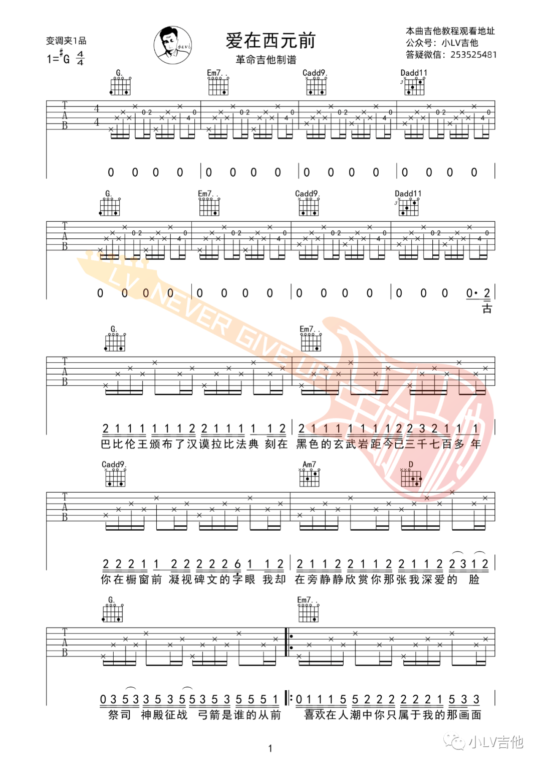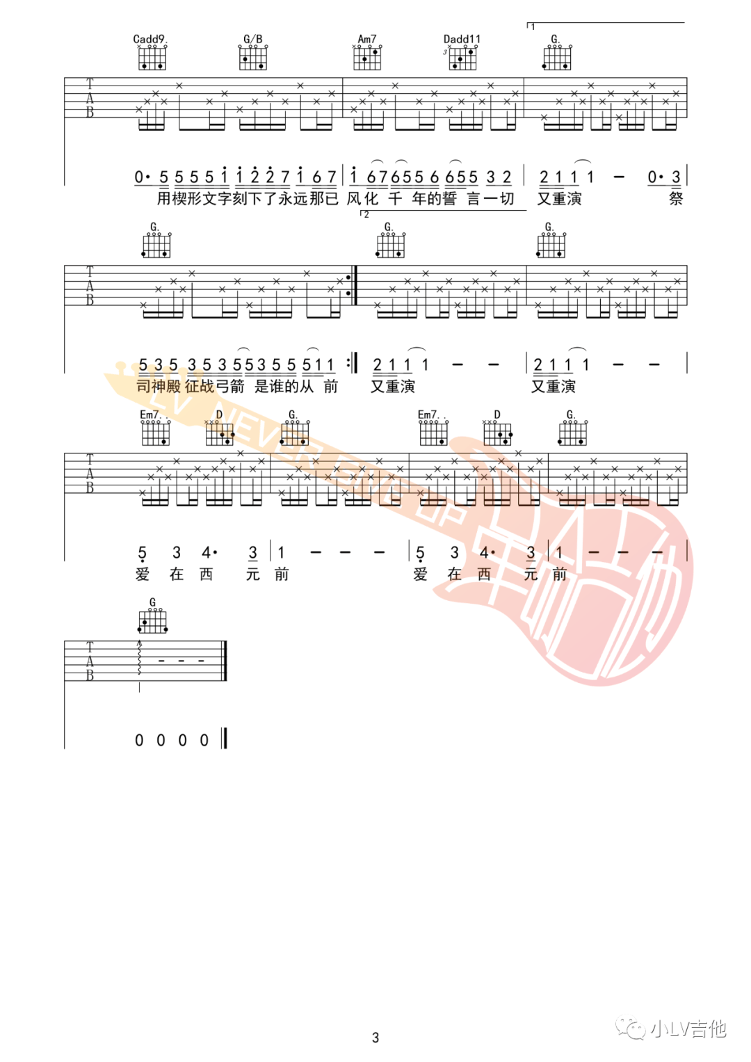 周杰伦《爱在西元前》吉他谱,革命吉他编配出品,共有3张高清图谱。