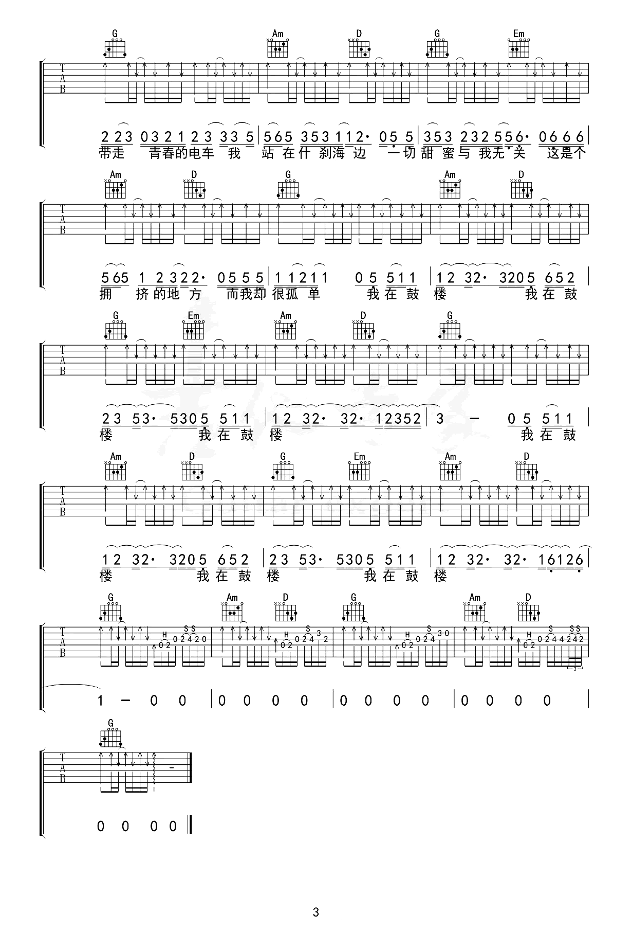赵雷《鼓楼》吉他谱,采用G调指法编配,共有3张高清图谱。鼓楼吉他谱,赵雷演唱的一首经典民谣歌曲,《鼓楼》吉他弹唱谱,原调为#G调,选用G调和弦,变调夹夹一品,六线谱完整编配共三张图片,感谢吉他专家扒谱出品,曲谱宝更新上传。 站在城市鼓楼下,我们皆是过客,靠着墙壁,默不作声。时光如流水,人来人往,岁月穿梭,留下的唯有匆匆过客。生命如此短暂,留下的是我们的足迹,未来与未知,都是我们要探寻的远方。