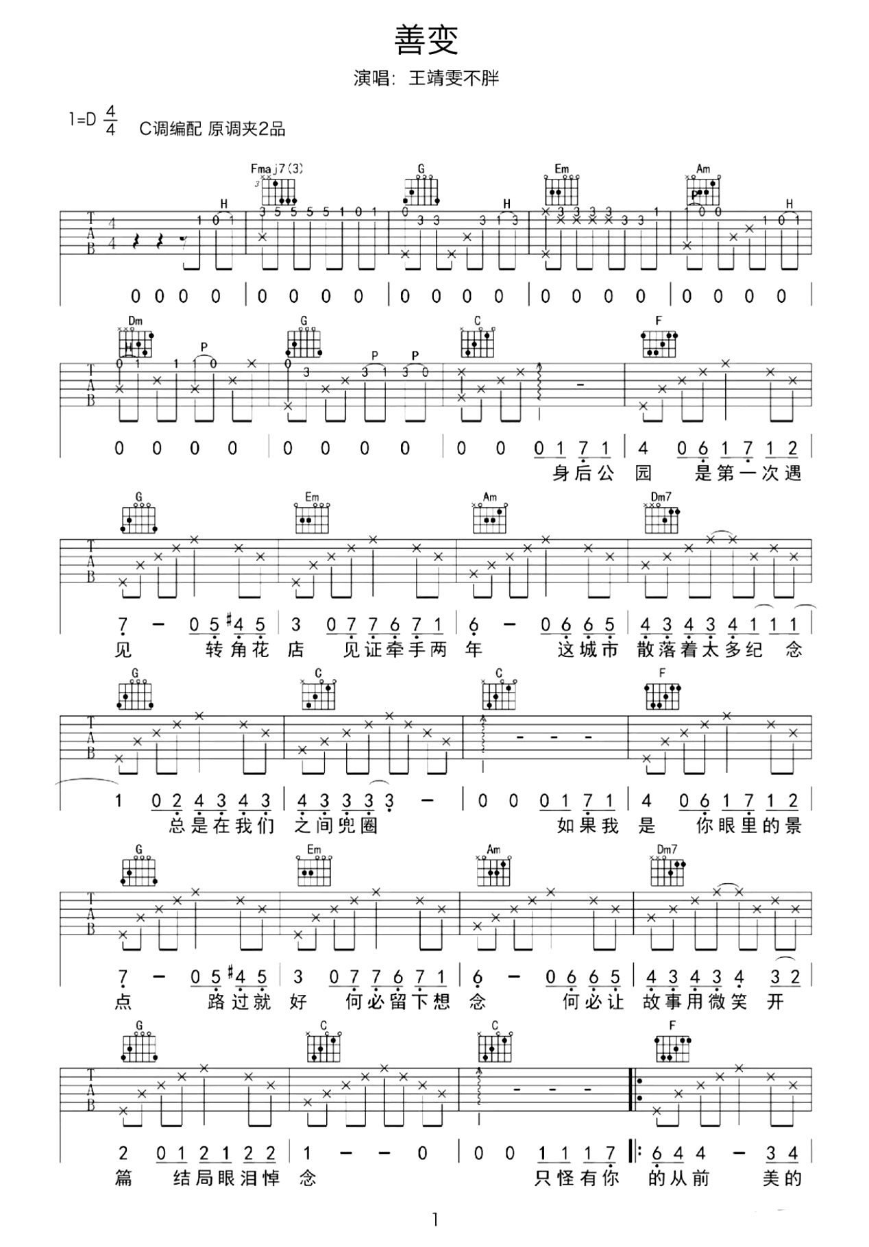 王靖雯不胖《善变》吉他谱,采用C调指法编配,共有3张高清图谱。善变吉他谱,王靖雯不胖的一首热门流行歌曲。只有我们彼此之间最清楚,时间是如何改变了我们。《善变》吉他弹唱六线谱,4/4拍的节奏,这首歌曲的原调为D调,曲谱采用了C调指法进行编配,琴友们演唱时夹变调夹2品可回到原调,也可以个人嗓音情况选择。完整版共两张图片,曲谱宝上传更新。 过去越久远,回忆却越清晰。所以故事轻易翻篇,但情节却深深印在我们的脑海中。也正因如此,人们总是需要留下纪念,为了不舍,也为了证明一些爱曾经真实存在过。