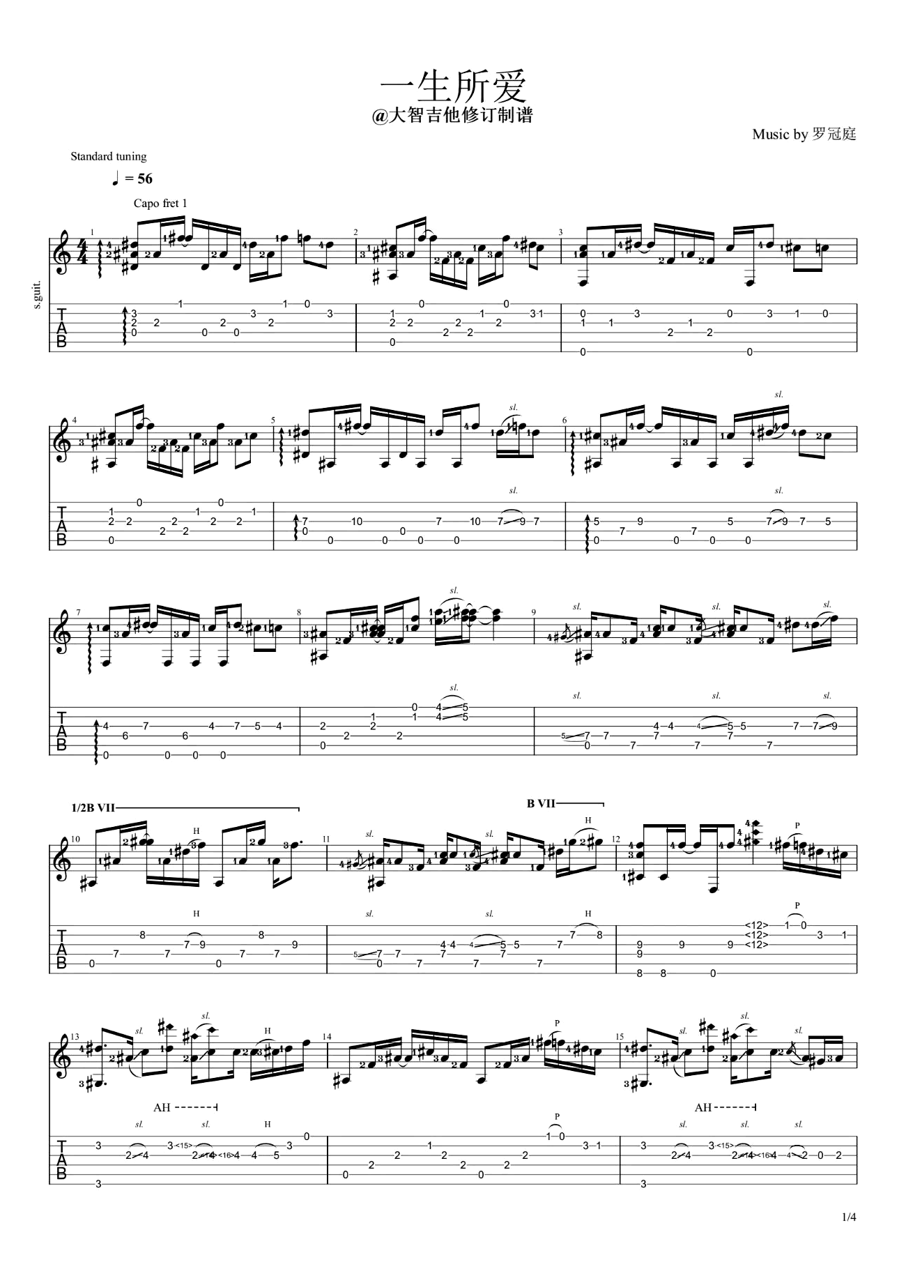 大话西游主题曲《一生所爱》吉他谱,共有4张高清图谱。一生所爱吉他谱,卢冠廷经典粤语歌曲改编,周星驰电影《大话西游》片尾主题曲,随谱附上歌曲指弹吉他演奏视频,琴友们参考练习。《一生所爱》吉他独奏谱,标准音调弦,变调夹1品。完整版共4张图片六线谱,感谢大智吉他编配分享,曲谱宝更新。 苦海翻腾,爱与恨交织,命运无法逃脱。至尊宝在漫天风沙中,孤独无依地向前行,那淡淡的旋律,抒发了爱的无奈与凄凉。