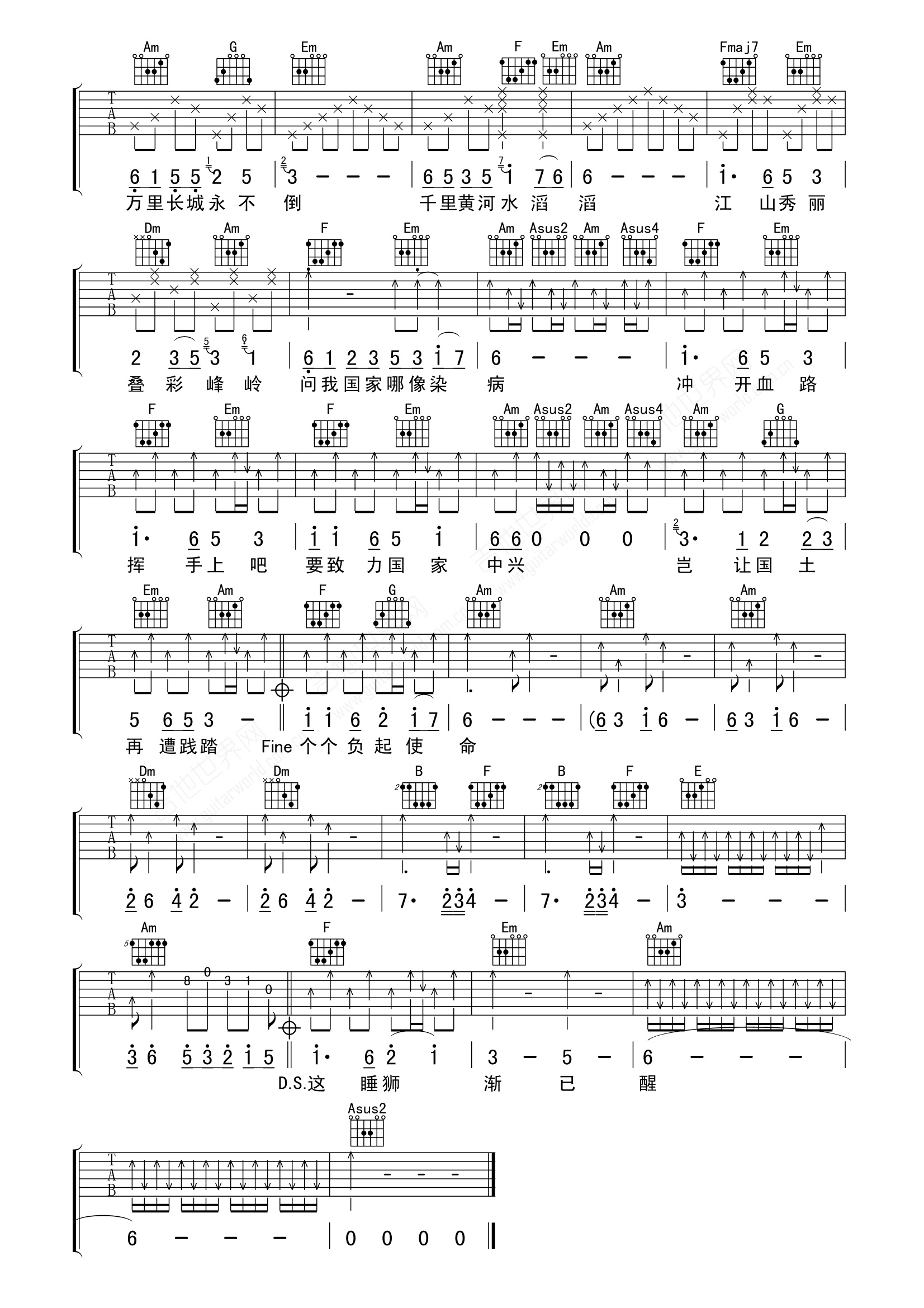 罗文《万里长城永不倒》吉他谱,共有2张高清图谱,免翻页排版设计。