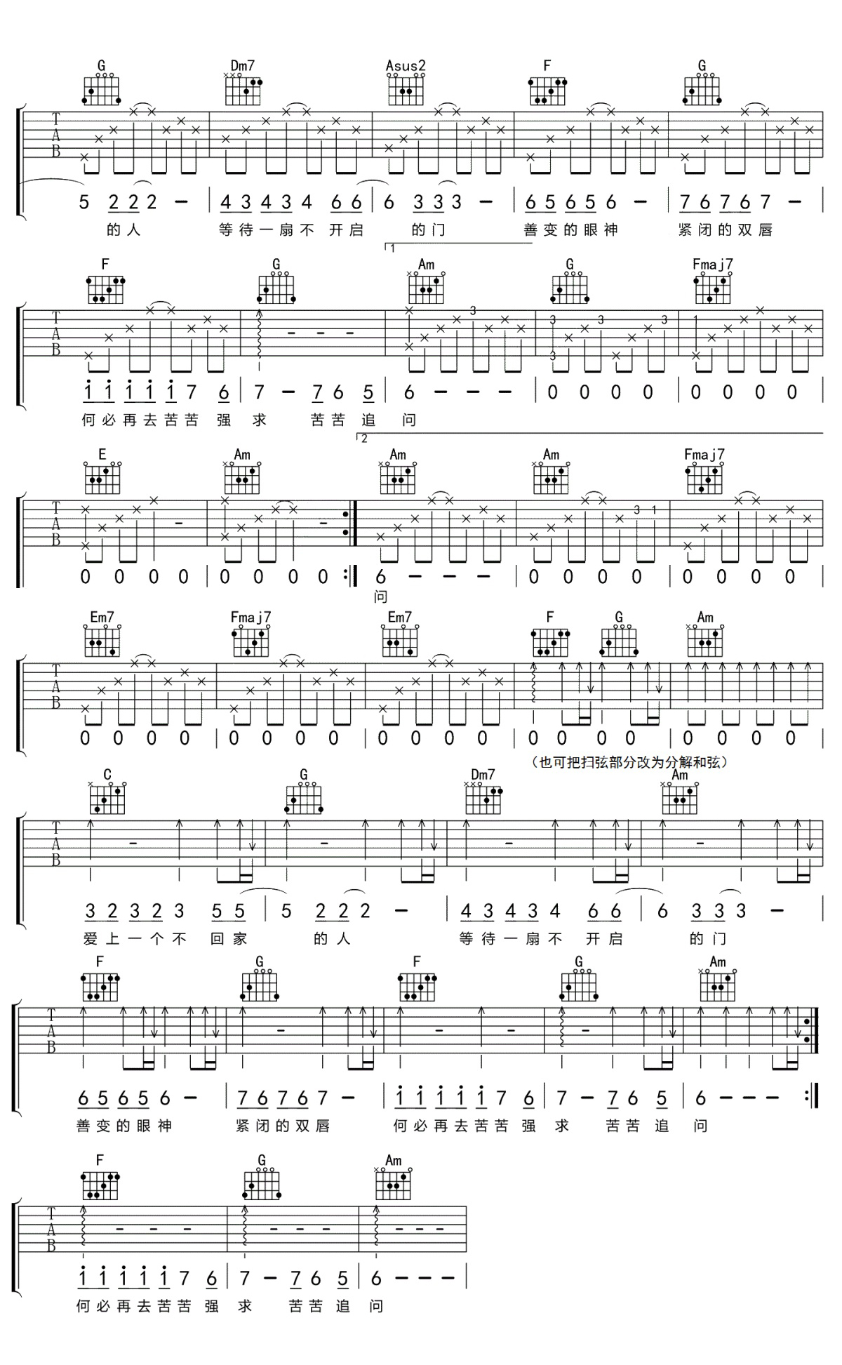 林忆莲《爱上一个不回家的人》吉他谱,共有2张高清图谱,免翻页排版设计。 一段情,始于心动,止于心痛;一颗心,热于感动,冷于不动。不要轻易试探一段情,不要随意伤害一颗心。谎言试探的东西还是谎言,猜疑得到的结果还是猜疑。爱是一份执着的真心,更是一份笃定不移的信赖。往往不会在大的磨难下而变冷,却会在一件件小事上远离。不要让无话不谈变成无话可谈,时间久了不是感情没了,而是缺乏了主动的勇气。善待一份缘,暖暖的在心底;珍惜一段情,真真的去呵护;一个人,纯纯的去喜欢。有些人,错过了就不再回来。