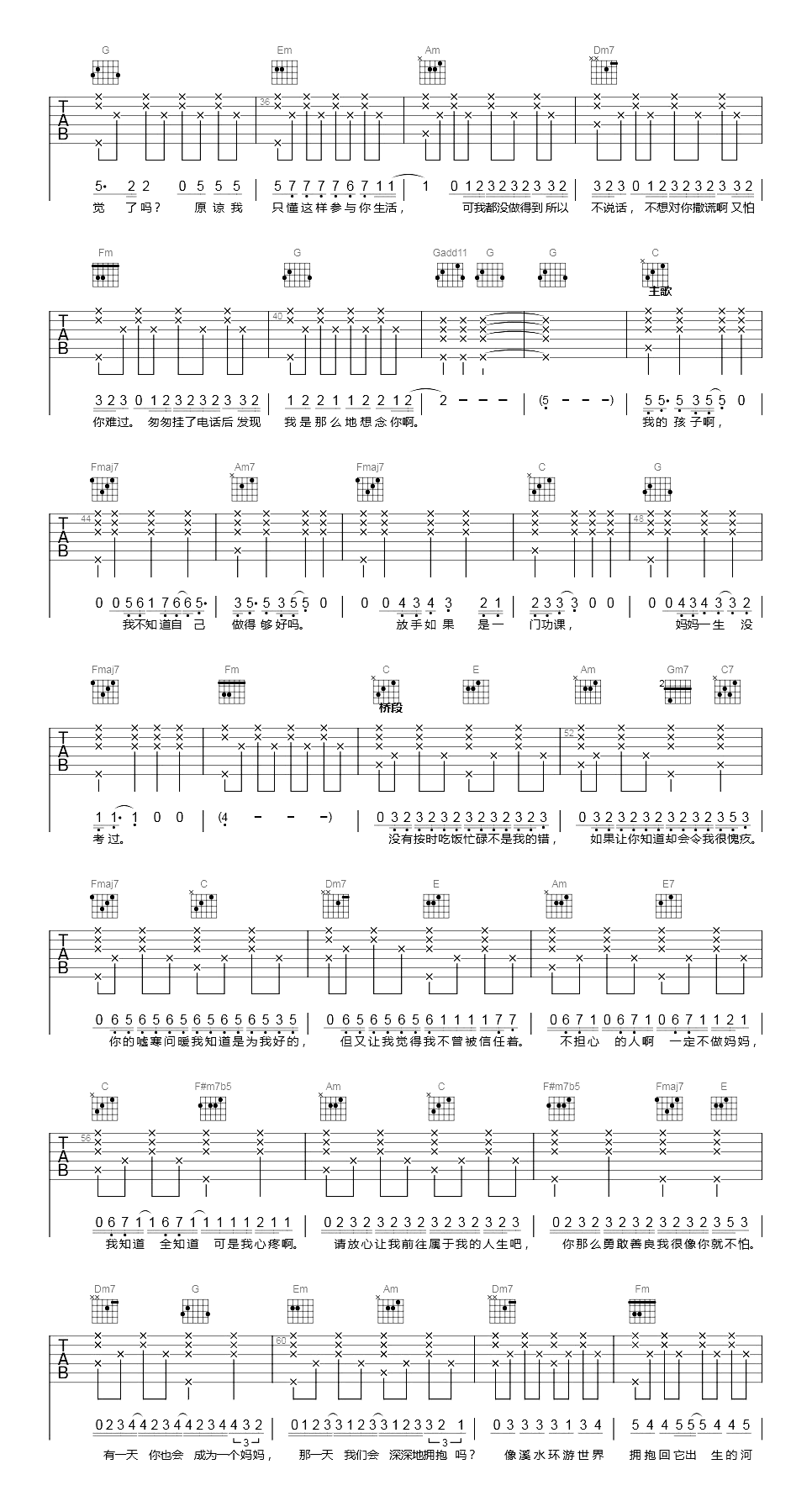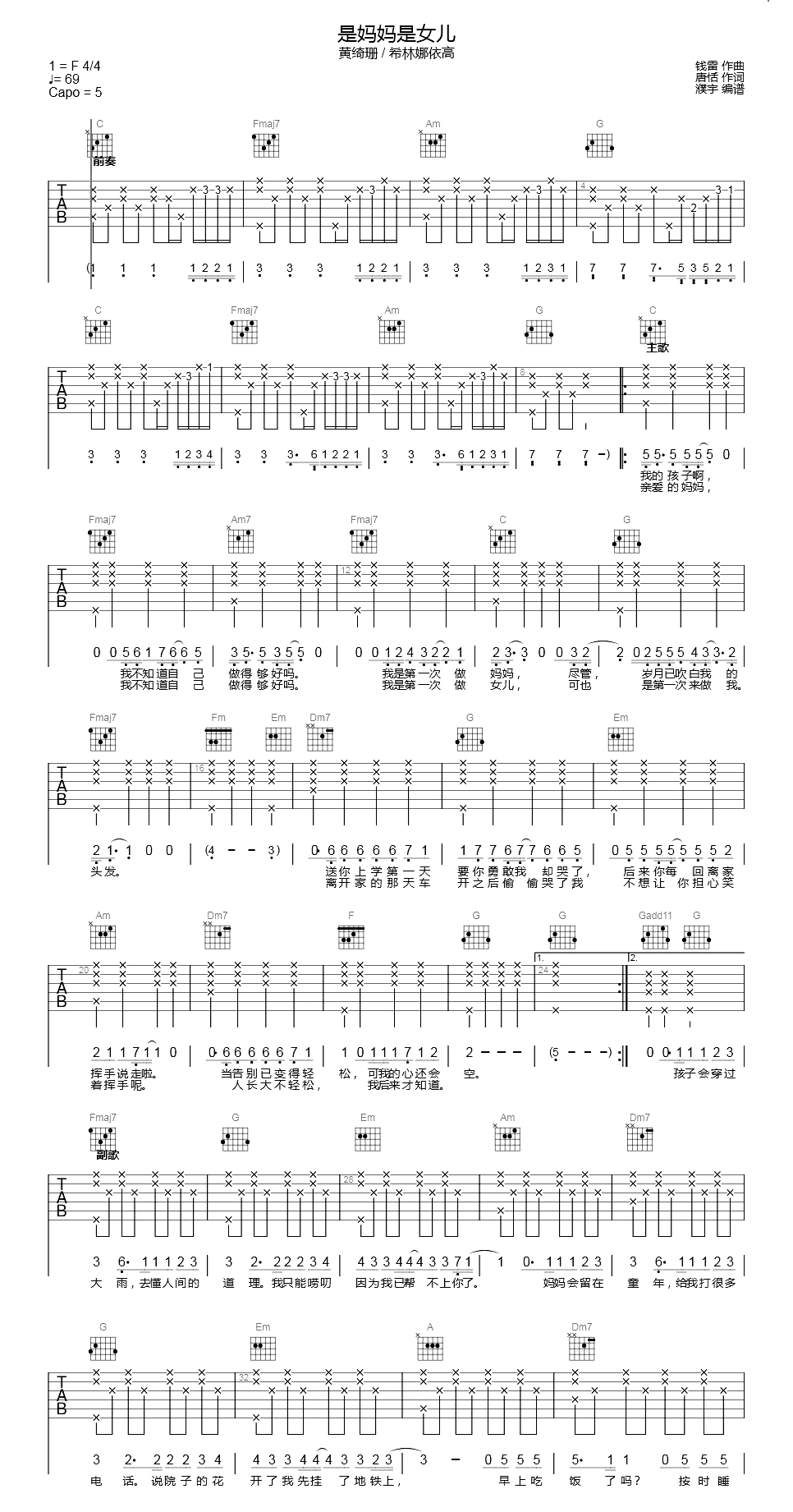 黄绮珊/希林娜依《是妈妈是女儿》吉他谱,采用C调指法编配,共有3张高清图谱。是妈妈是女儿吉他谱,黄绮珊 /希林娜依高暖心合唱,表达了母女间内心最真挚的情感和思念,满怀柔情和牵挂,让人泪目。《是妈妈是女儿》吉他弹唱谱,原调F,吉他谱采用C调指法,变调夹Capo5品,六线谱共三张图片,曲谱宝上传更新。 母女之间的感情,从来都是世间最真挚、最悠长的纽带。凝视着这份不曾言明的爱意,我们仿佛能够感受到时光在流淌,也借此思考着人生中那些最珍贵的情感和最美好的回忆。