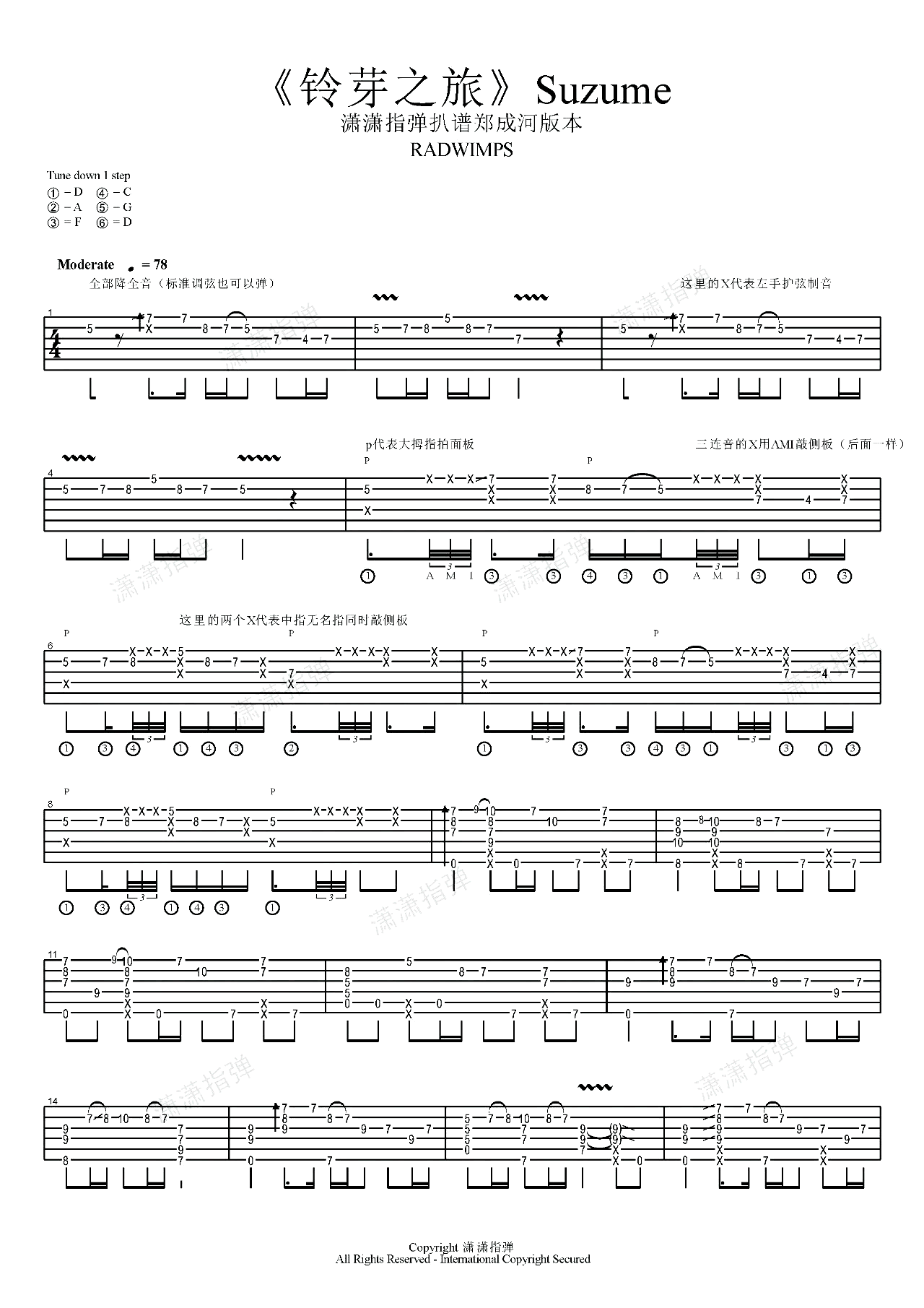 郑成河《铃芽之旅》吉他谱,共有4张高清图谱。铃芽之旅指弹吉他谱,郑成河演奏版本。新海诚同名电影主题曲。《铃芽之旅》吉他独奏谱,全部降全音,标准调也可以弹。六线谱完整版共四张图片,随谱附上演奏视频琴友们参考练习。感谢潇潇指弹扒谱编配,曲谱宝更新分享。 旋律停留耳畔间,带着一份神秘的气息,仿佛将我们带入了一个未知的世界。它带给我们一些悲伤,却也让我们感受到未来的希望,如同一束光芒闪烁在黑暗之中。清晰传递了《铃芽之旅》的世界观,壮丽、美丽、坚强和孤独,还有那种不知不觉跟唱的魅力,让我们沉浸在其中难以自拔。