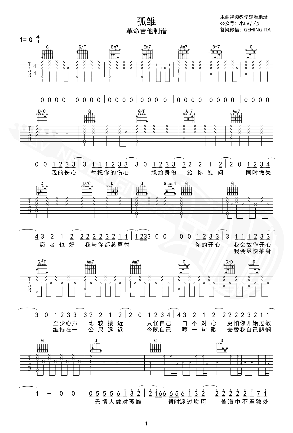 孤雏吉他谱_AGA_G调弹唱谱_完整版图片谱