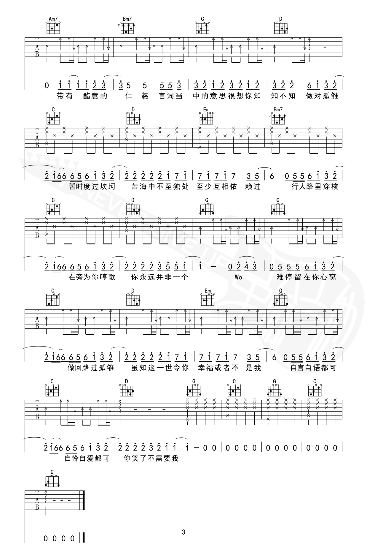 AGA《孤雏》吉他谱,采用G调指法编配,共有3张高清图谱。孤雏吉他谱,AGA演唱的一首粤语歌曲。带着一丝勇气和坚定,为我们展现了爱与牵挂的真挚情感。《孤雏》吉他弹唱谱,曲谱采用G调指法,推荐原调不用变调夹,完整版六线谱编配共三张图片谱例,感谢革命吉他制谱分享,曲谱宝整理上传。 也许我们每个人心中都有一个不能在一起的Ta,深爱而又痴恋,却又无法执手相依。但只要他们能够快乐幸福,我们的内心就会因此纯净而满足,即使是一只感情上的孤雏,也能在这柔软的旋律中感受到安全感和温馨。