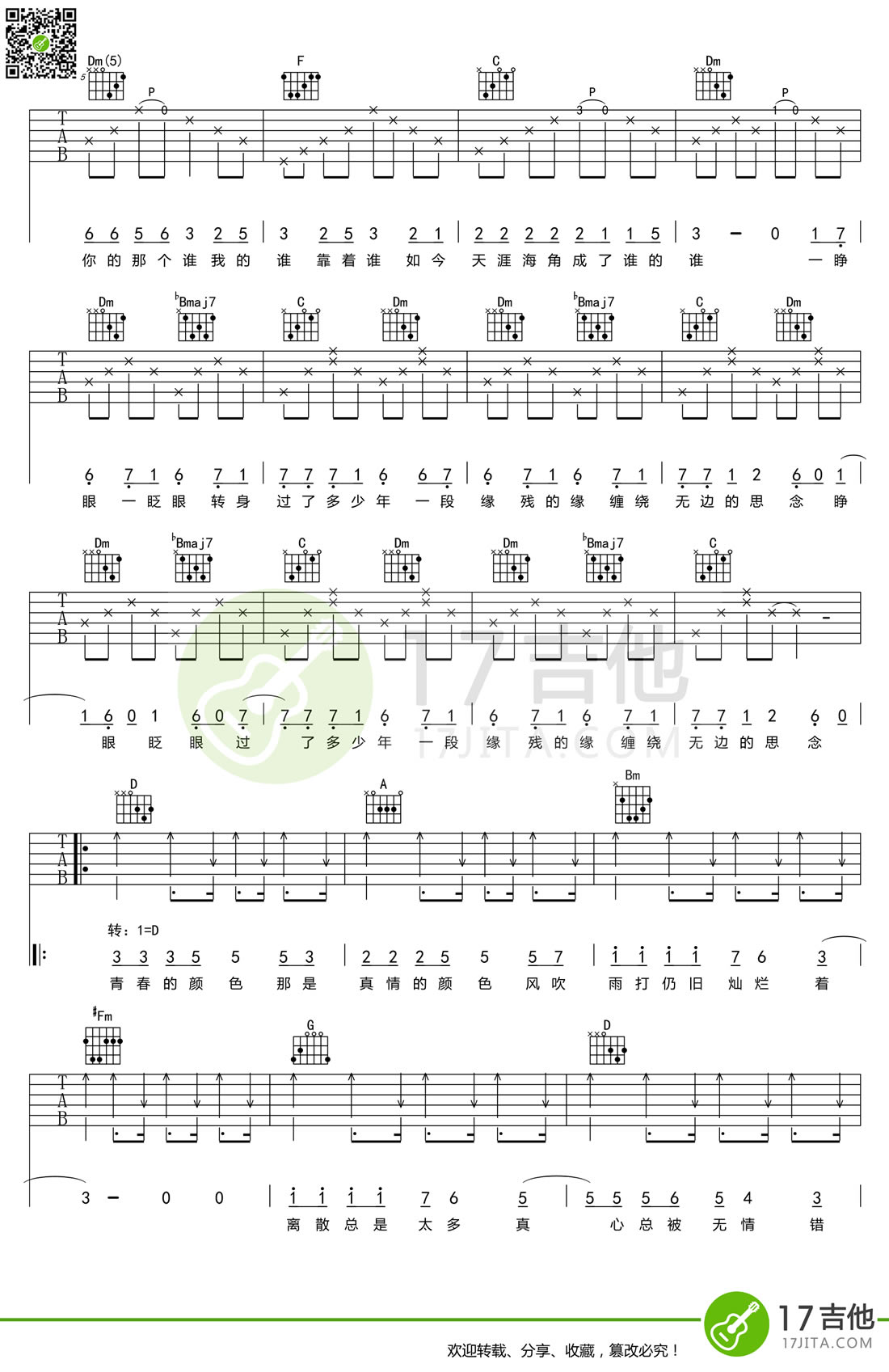 曾子岚《青春的颜色》吉他谱,齐元义编配出品,共有3张高清图谱。曾子岚演唱,青春的颜色吉他谱,无意在中央电视台12频道的普法栏目剧《我的青春》听到的主题曲,当时一听到就有一种ding的感觉!觉得词曲都写的很不错,曾子岚自己填词作曲的一首原创歌曲,唱出了青春的种种,感觉好像自己也经历过这种时候;青春的颜色吉他六线谱,歌曲清新舒缓适合吉他弹唱。
