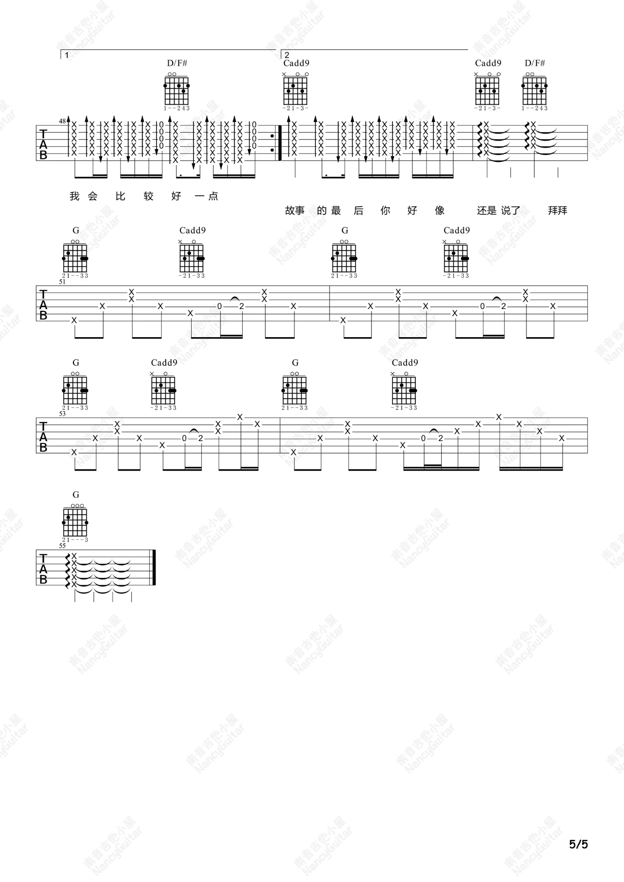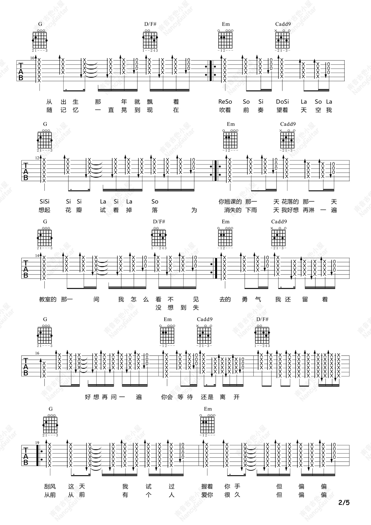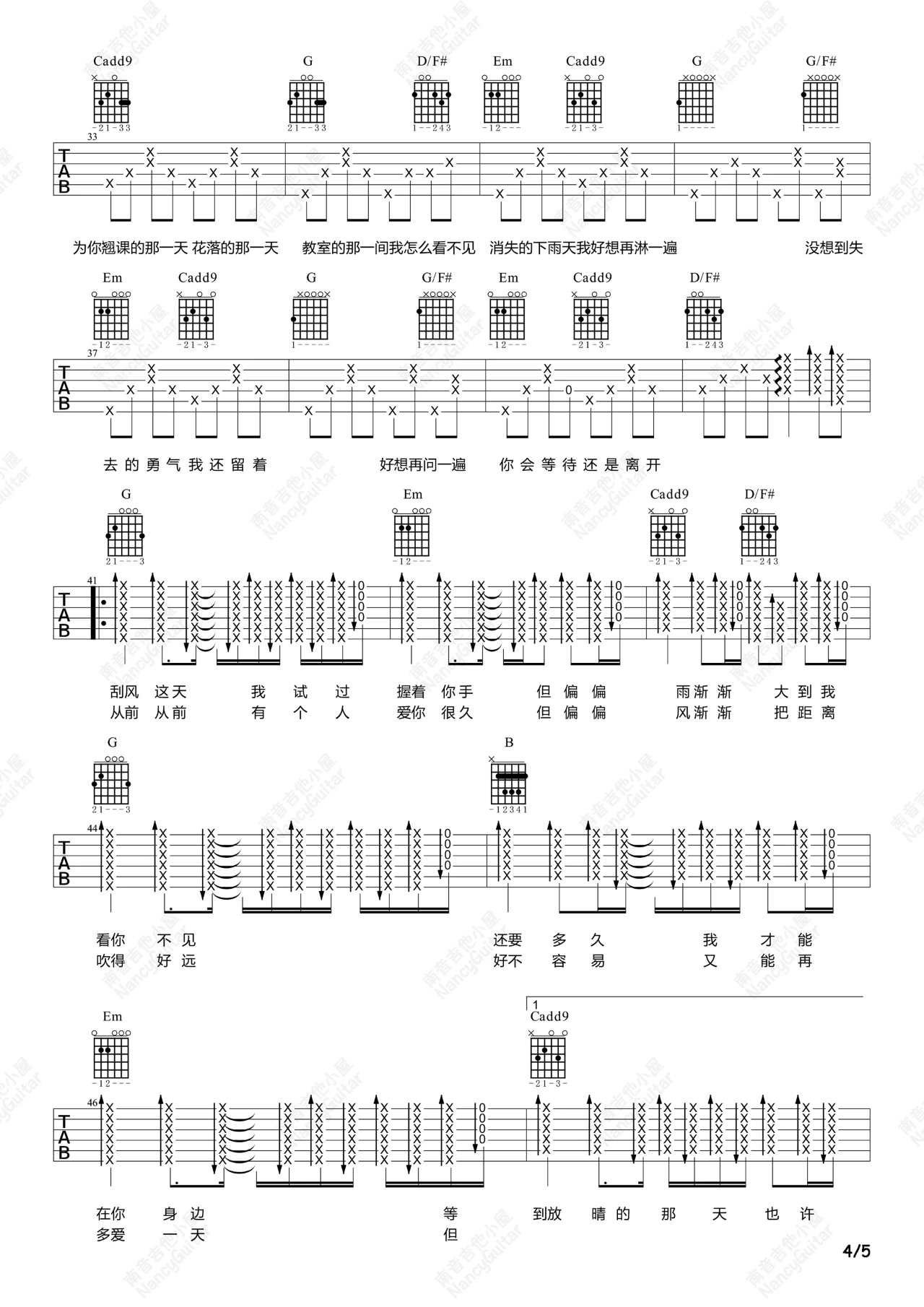 周杰伦《晴天》吉他谱,南音吉他编配出品,共有5张高清图谱。