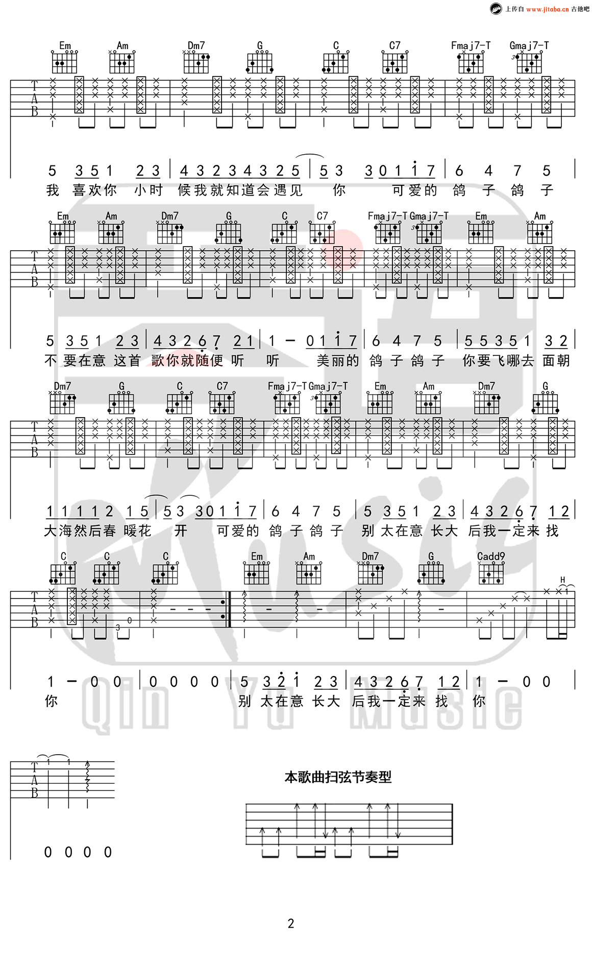 林晨阳《鸽子》吉他谱,琴语MUSIC编配出品,共有2张高清图谱,免翻页排版设计。《鸽子》吉他谱,林晨阳的一首原创音乐作品,鸽子弹唱谱,C调指法编配,变调夹根据自己嗓音条件选择。一首让人欲罢不能的歌曲,那是有鸽子的一个黄昏,女孩的出现不早不晚,她的微笑使我的内心春光明媚,似白鸽般温和。一切都显得那么自然,仿佛奇遇。我喜欢一个女孩,短发样子很可爱,她从我的身边走过去,我的眼睛都要掉出来,她喜欢一个人走,她说朋友并不多,我很愿意做你的朋友,即使不是那一种朋友。