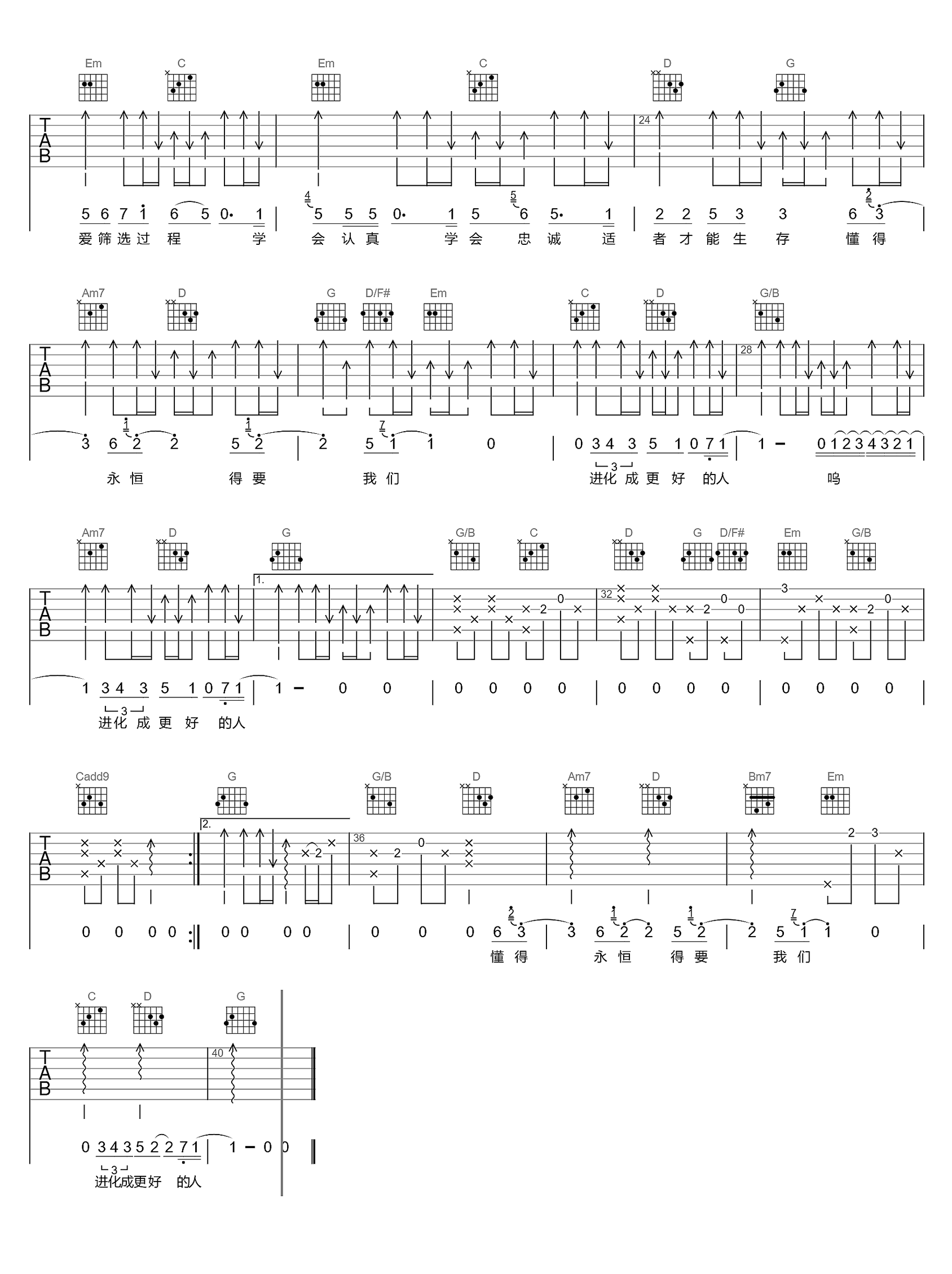 《达尔文》吉他谱,采用G调指法编配,共有2张高清图谱,免翻页排版设计。达尔文吉他谱,蔡健雅的一首经典歌曲,林俊杰翻唱版本,爱让我们进化成更好的人。《达尔文》吉他弹唱谱,选用G调和弦指法编配,降半音调弦,共两张图片六线谱,曲谱宝上传分享。 一首非常有趣的歌曲,它用进化论的观点,将恋爱中那微妙且复杂的变化描绘得淋漓尽致。在物竞天择和适者生存的概念中,它展现了所有徘徊在爱情旋转门中的男女感情动物们,那种内心的冲突与求索,被淋漓展现在歌曲的每个音符之中。