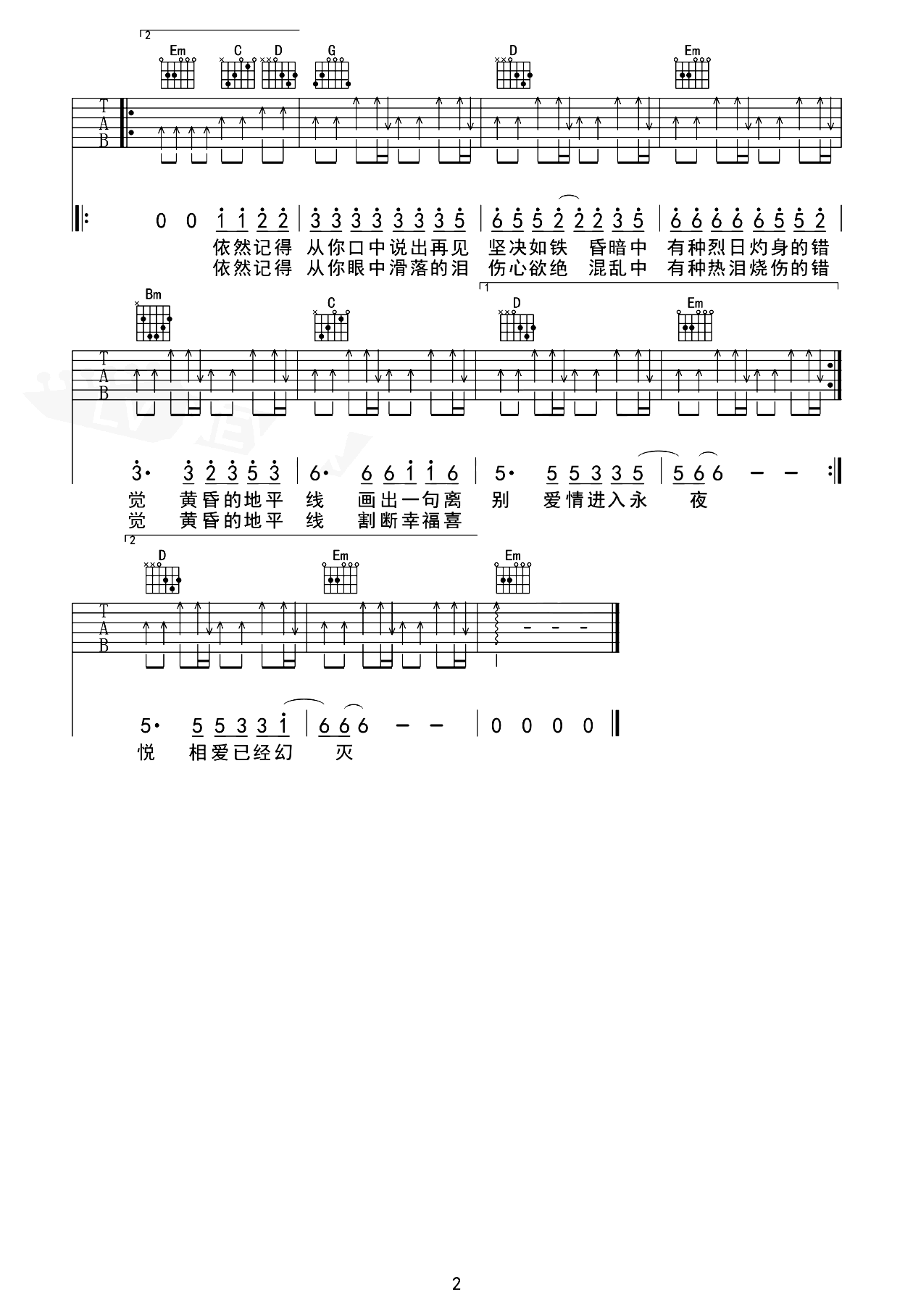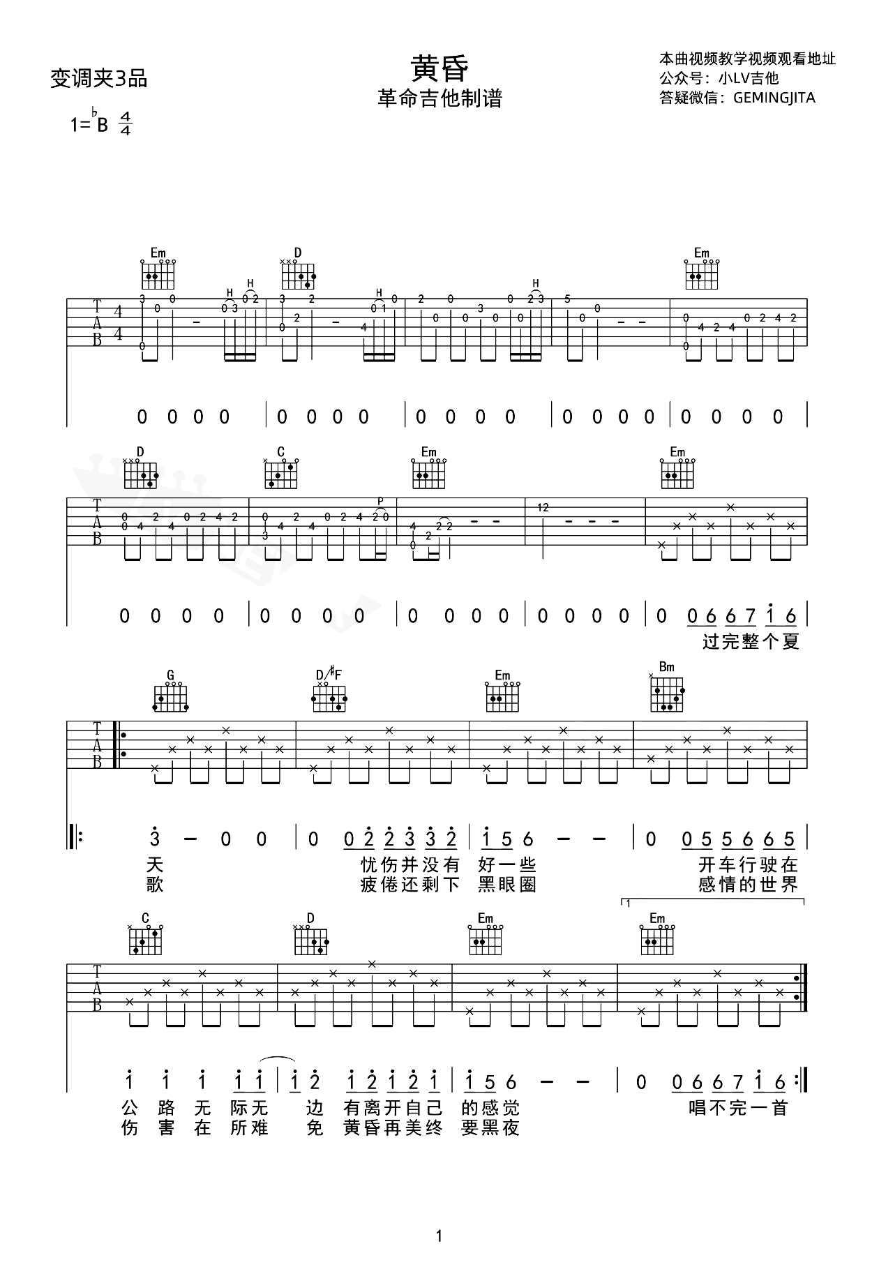 周传雄《黄昏》吉他谱,采用G调指法编配,共有2张高清图谱,免翻页排版设计。黄昏吉他谱,周传雄的一首曲调悲婉的经典老歌,也是KTV必点的男人悲伤情歌。《黄昏》吉他弹唱谱,原调降B,用G调和弦指法,变调夹capo3品,六线谱共两张图片谱例,感谢革命吉他出品分享,曲谱宝上传更新。 我依然清晰地记得你当时坚决无比的再见,深深地刻印在我的心里。在那昏暗的空气中,仿佛烈日灼身,让我痛苦地感受着离别的残酷和无奈。黄昏的地平线上,绘制出了离别的轮廓,爱情在这一刻被彻底封存,沉入永夜的黑暗。