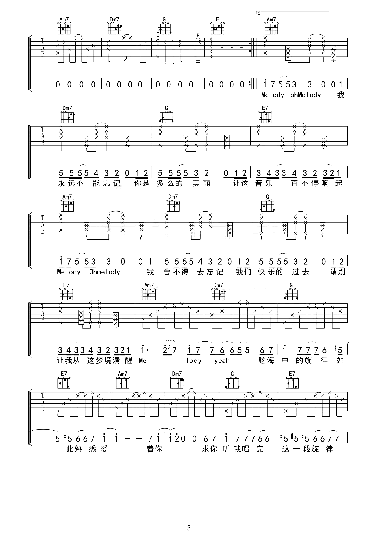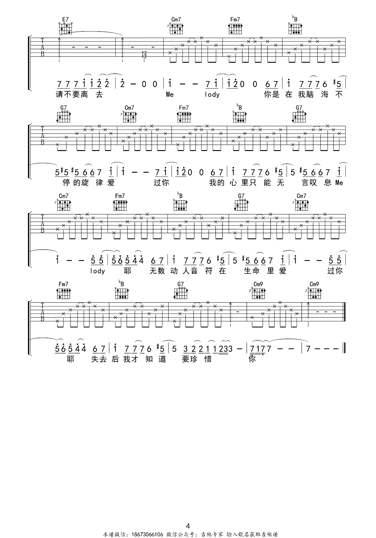 陶喆《Melody》吉他谱,采用C调指法编配,共有4张高清图谱。Melody吉他谱,陶喆情歌,也是为前女友创作的歌曲。《Melody》吉他弹唱谱,原调为E调,采用了C调指法进行编配,变调夹Capo4品,完整版六线谱共四张图片,感谢吉他专家编配出品,