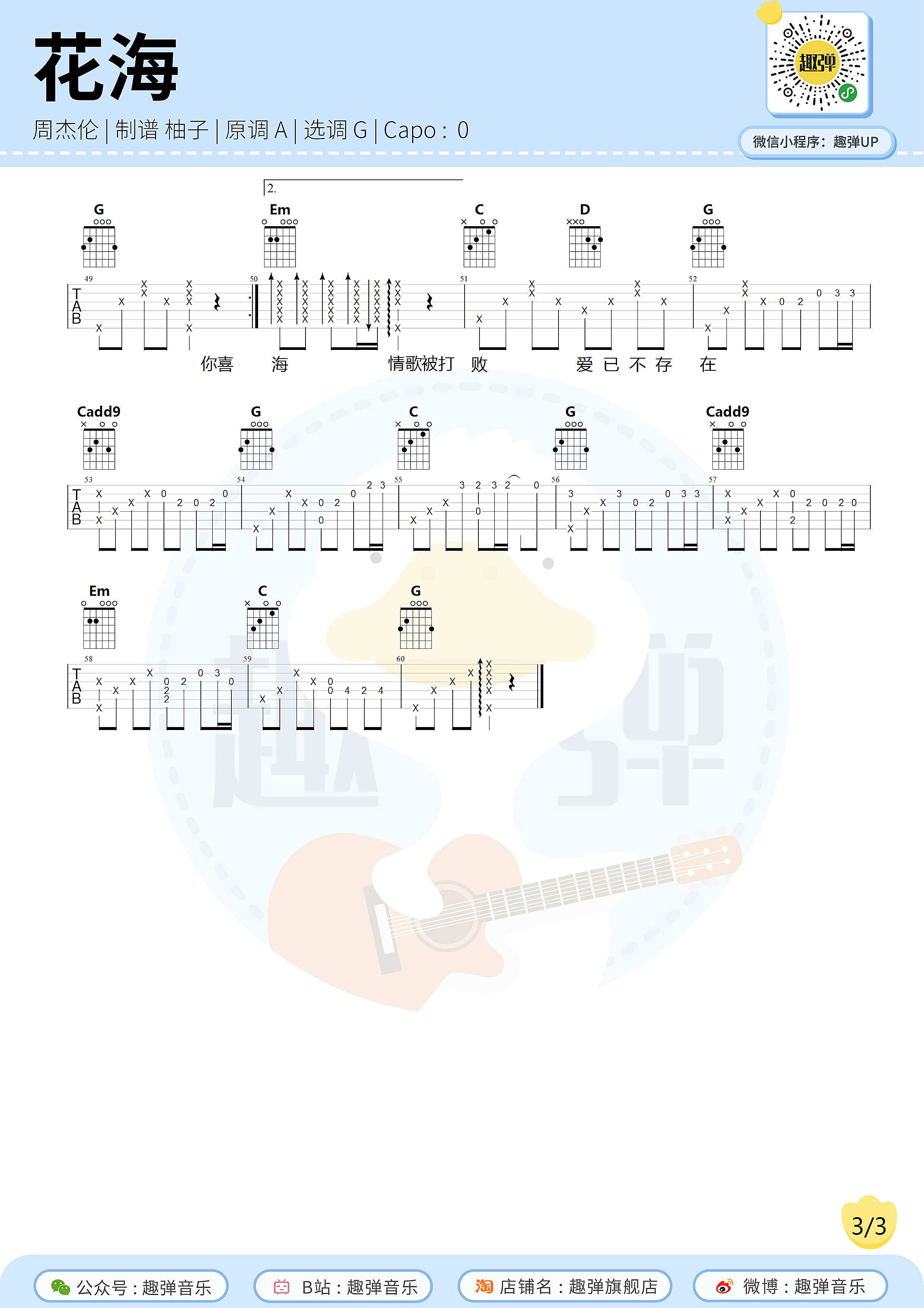 周杰伦《花海》吉他谱,趣弹UP编配出品,共有3张高清图谱。周杰伦《花海》吉他谱_G调吉他弹唱谱