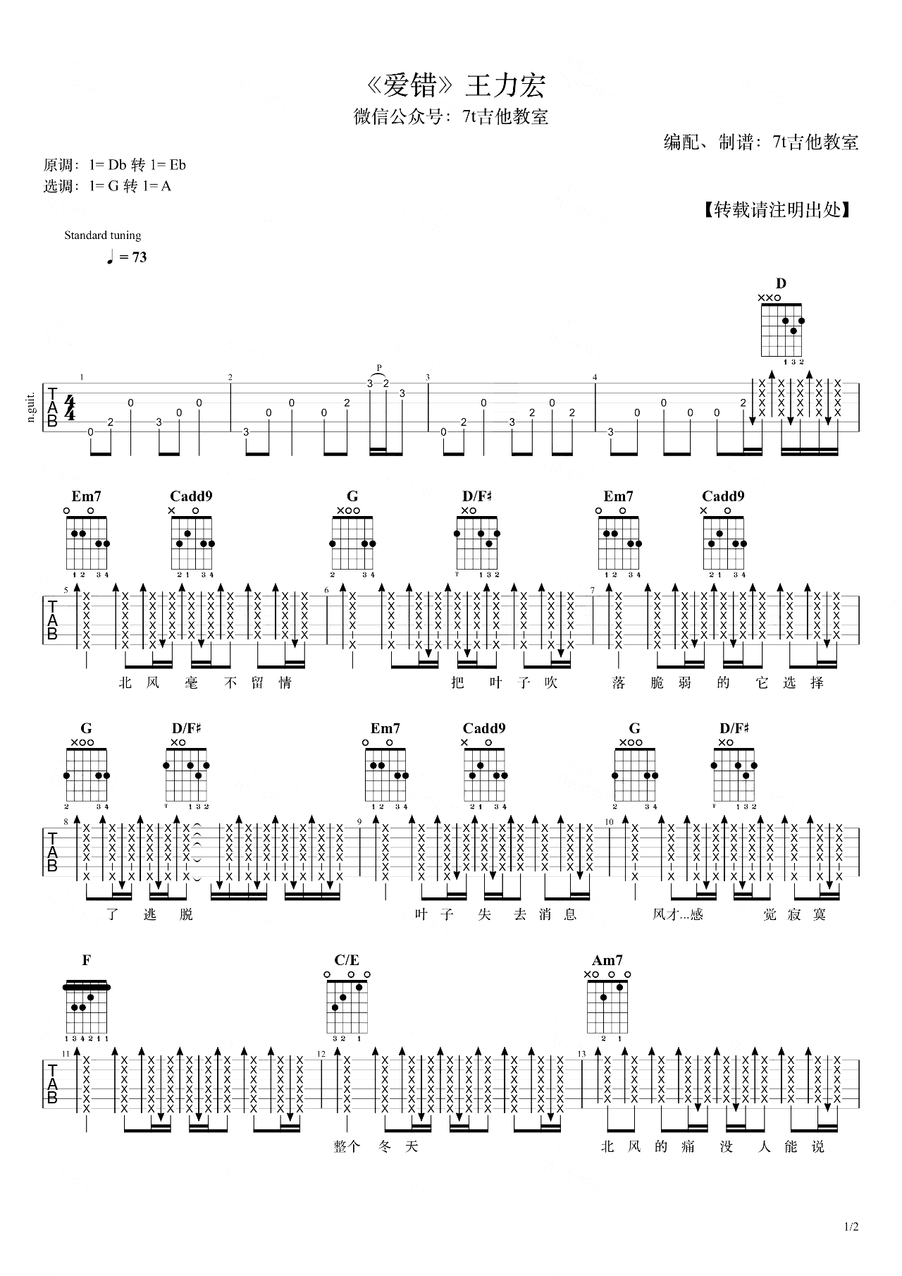 王力宏《爱错》吉他谱,共有2张高清图谱,免翻页排版设计。爱错吉他谱,王力宏演唱的脍炙人口的经典慢歌。整首歌最惊艳的地方在于它的真假音转换,流畅自然,让听者非常享受!《爱错》吉他弹唱谱,原调是Db大调转Eb大调,用的是G大调转A大调的指法来编配,示范视频里是标准音调弦夹1品。想弹原调的话需要夹6品哦。六线谱共两张图片谱,感谢7T吉他教室出品,曲谱宝网站上传更新。 主歌开头以6415的走向为主,五级用了转位(斜杠和弦),形成低音下行。后面 G → G/F# → F → C/E 也是用了低音下行的编配手法,其中引入了降七级,听感上面更丰富,带有离调感觉。副歌升了调,进入A调指法之前用了A调的属七来过渡,这在转调里是很常见的。副歌部分用了副属和弦 C#7 → F#m7,以及251离调 Em7 → A7 → Dmaj7。