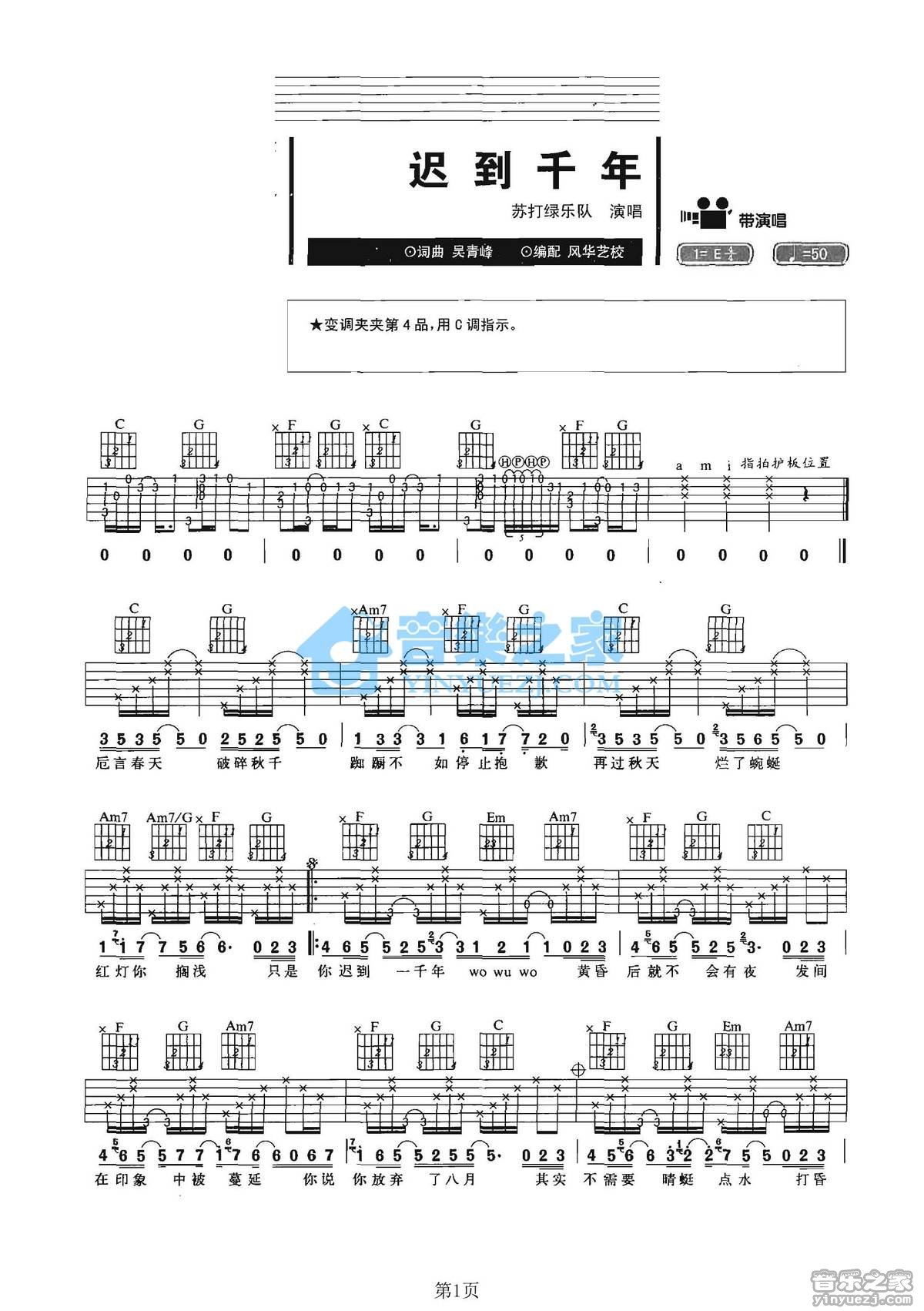 苏打绿《迟到千年》吉他谱,YYZJ编配出品,共有3张高清图谱。C调版《迟到千年》吉他弹唱六线谱