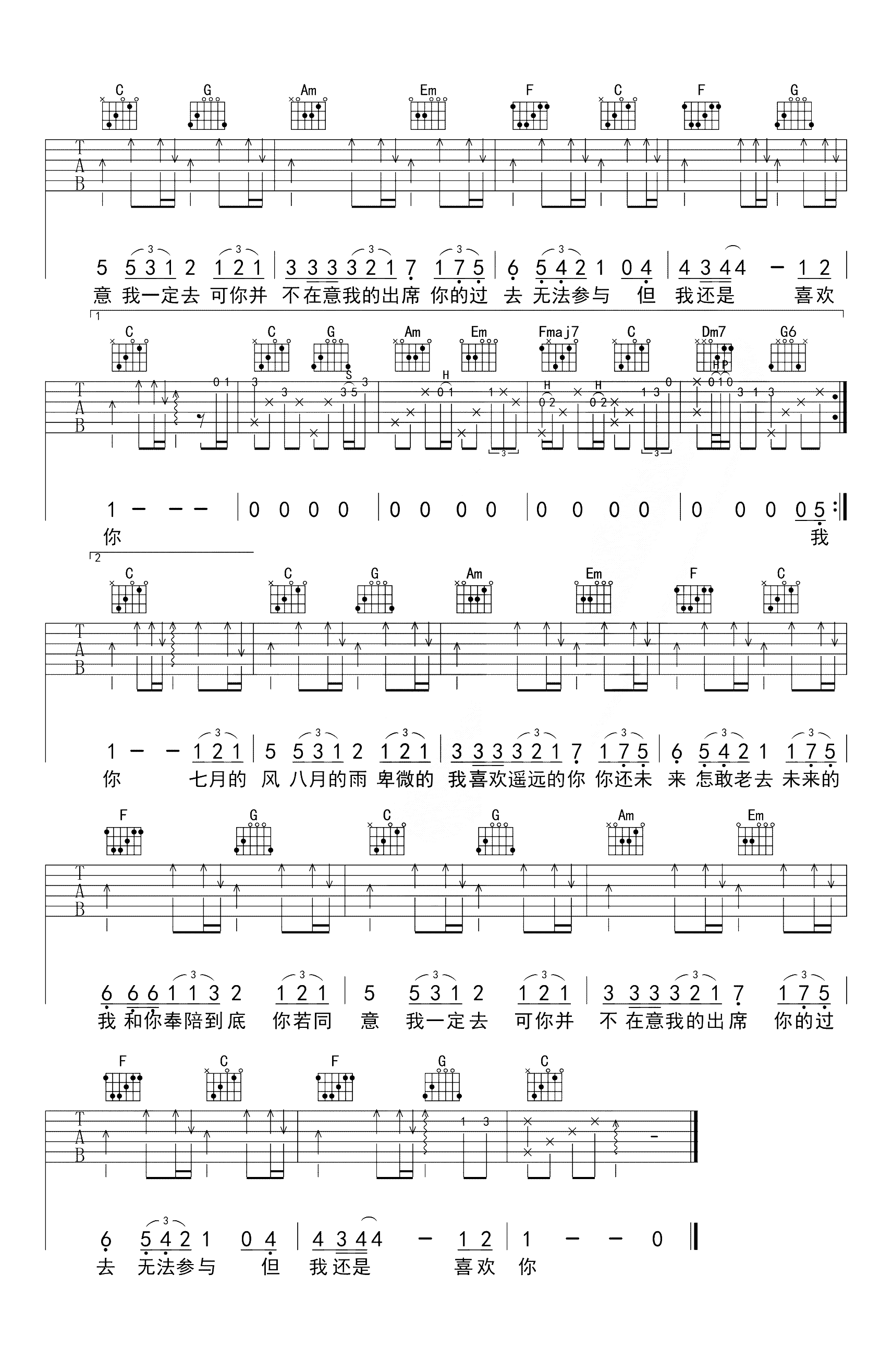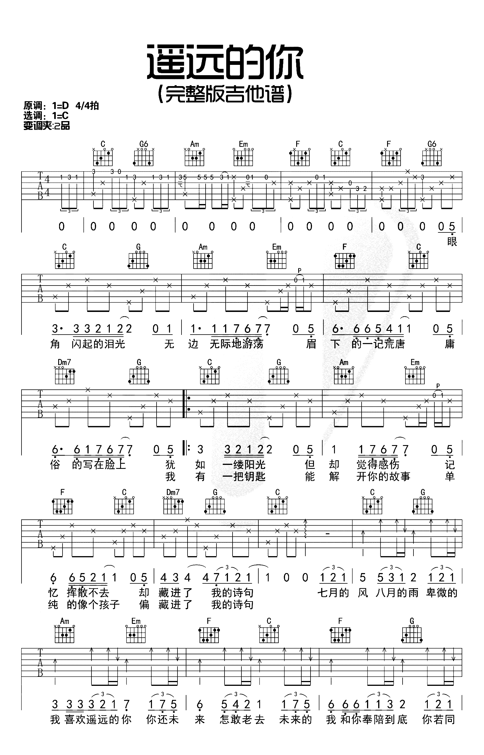 211小伙伴《遥远的你》吉他谱,西二吉他编配出品,共有2张高清图谱,免翻页排版设计。遥远的你吉他谱,221小伙伴演唱的一首网络热门民谣歌曲,遥远的你六线谱,带前奏间奏完整版,原调D选调C,变调夹夹第二品。同时编配了一份适合新手演唱的简单版吉他谱,根据大家的水平自由选择。整体难度不大,祝大家练琴顺利!吉他天下网站上传。抖音爆红的一首青春之歌,给了无数人心灵一个碰撞,每当听到这首歌,人们的心里总会想起好多红尘往事,歌曲不仅要献给自己的暗恋,更要献给我们的青春。