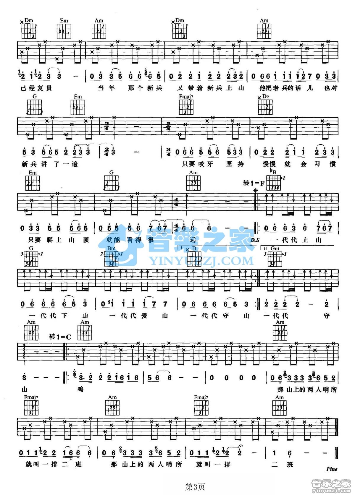 姜苏《一排二班》吉他谱,共有3张高清图谱。C调版姜苏《一排二班》吉他弹唱六线谱