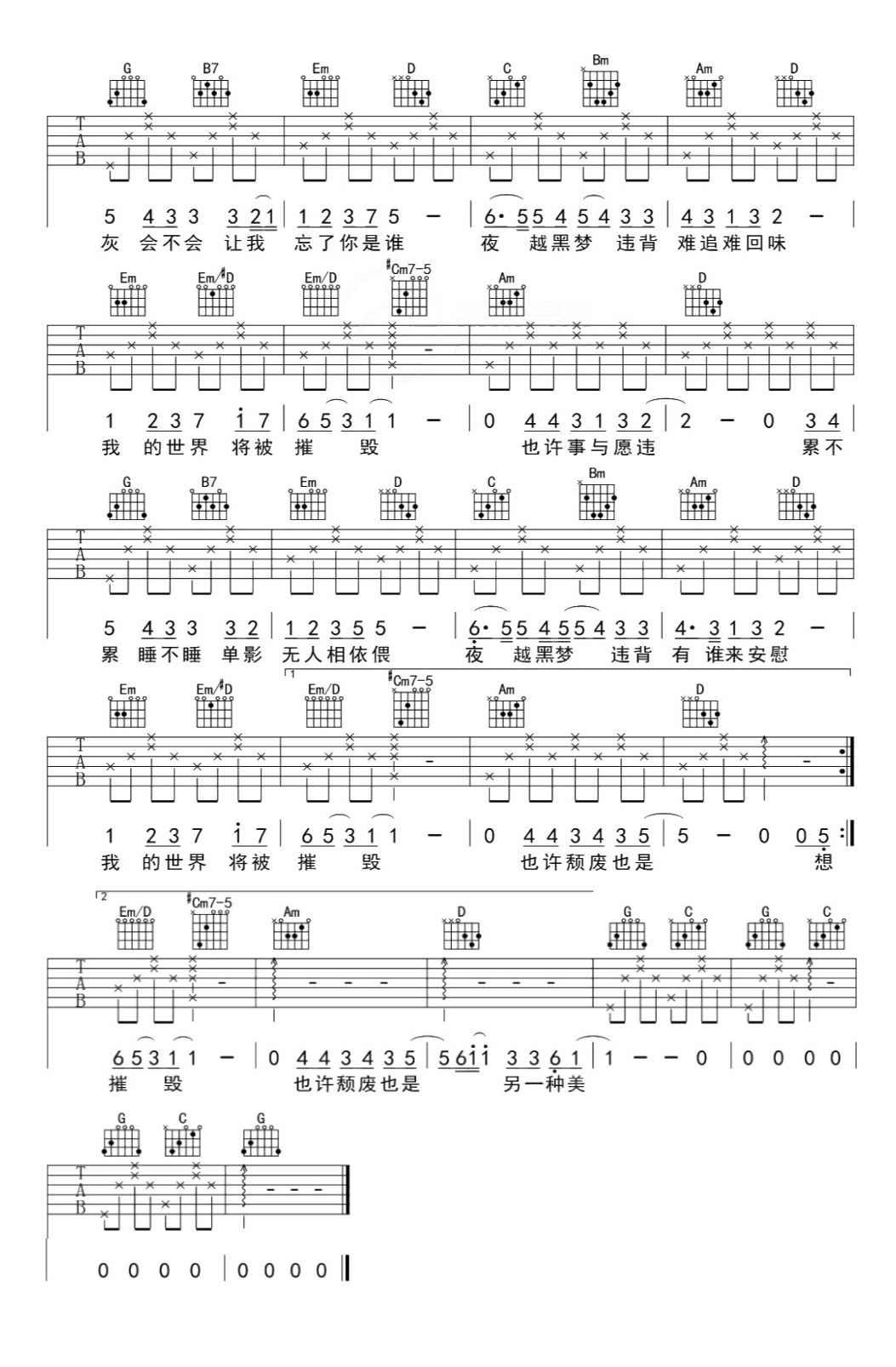 周杰伦《世界末日》吉他谱,果木浪子编配出品,共有2张高清图谱,免翻页排版设计。
