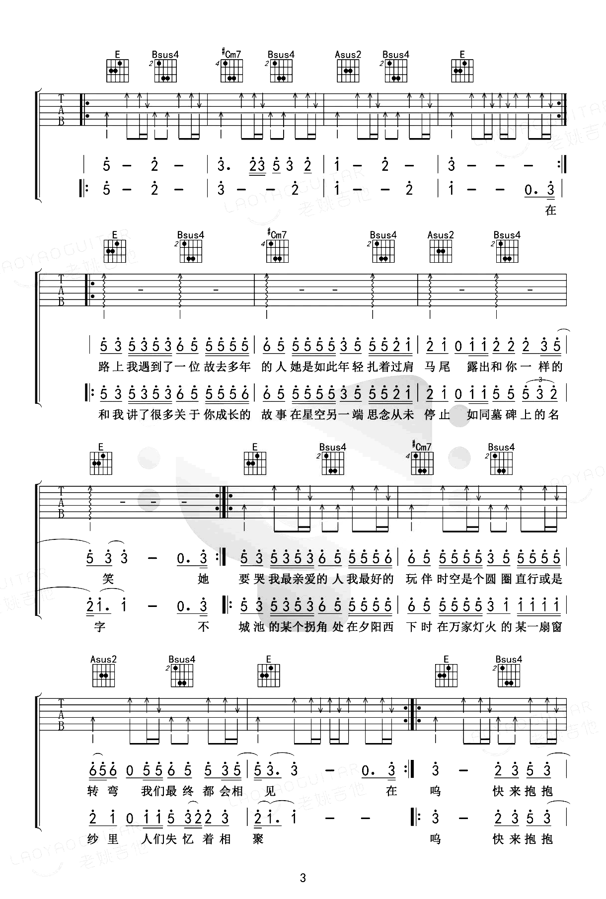 赵雷《我记得》吉他谱,共有4张高清图谱。我记得吉他谱,赵雷的一首热门歌曲。这首歌的声乐结构采用了1563451的和声走向,前奏和主歌部分略显复杂,而其余部分则是扫弦的律动节奏型。《我记得》吉他六线谱,选用原调E调指法,弹唱不用变调夹,共三张图片谱,感谢老姚吉他制谱编配,吉他事网站上传。 岁月匆匆如流水,我们一生中会与无数人和事相遇,也会在悄然离别的时光里感受无数的珍贵瞬间。我们在生命的交汇中不断相逢,告别,再度相逢。如果这些相遇有着深刻的内涵,愿我们能充分珍惜,不让留下悔恨的空隙。而那些不经意错过的机缘,如果命运再次眷顾,愿我们再次相遇,弥补那一丝丝的遗憾。