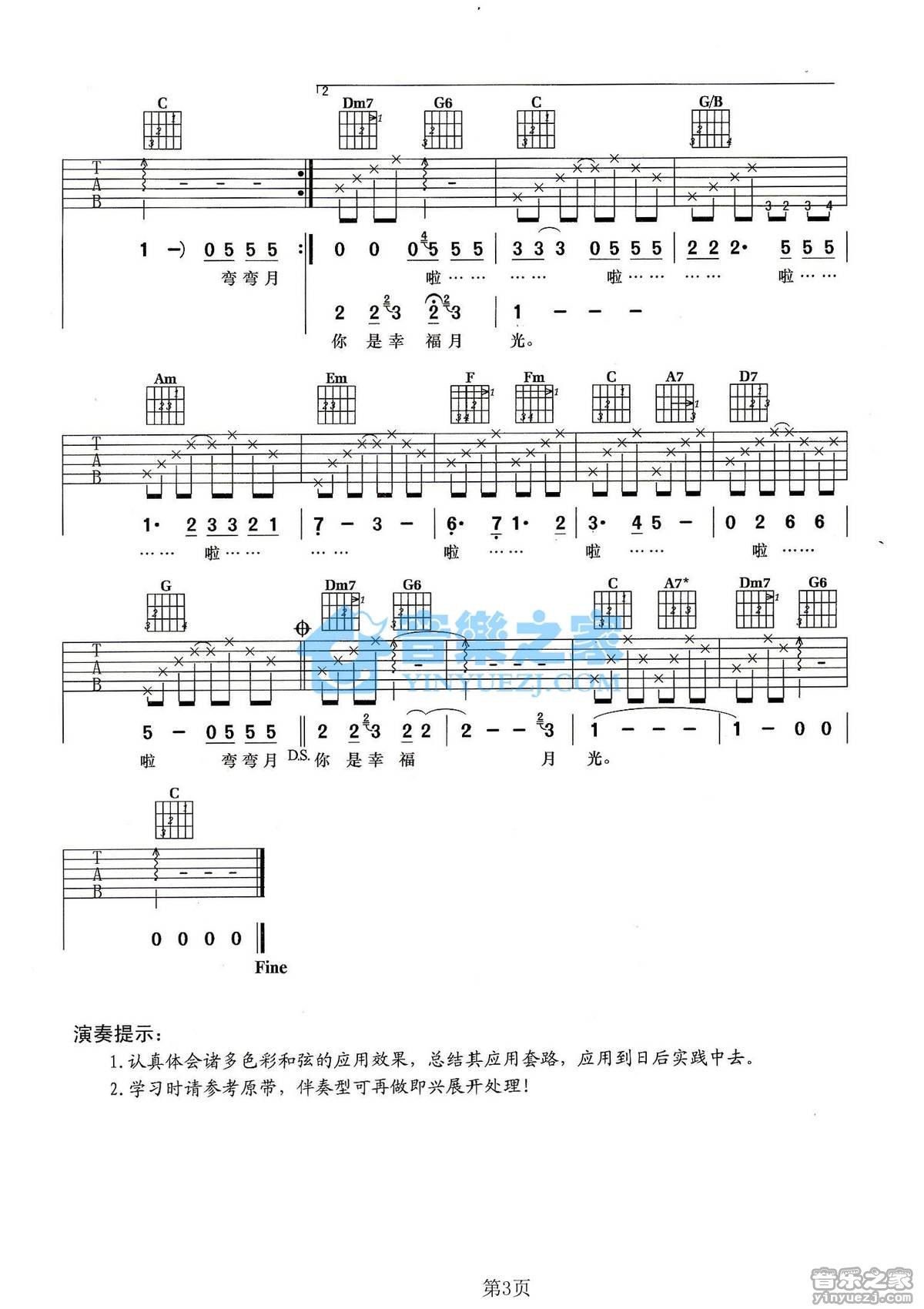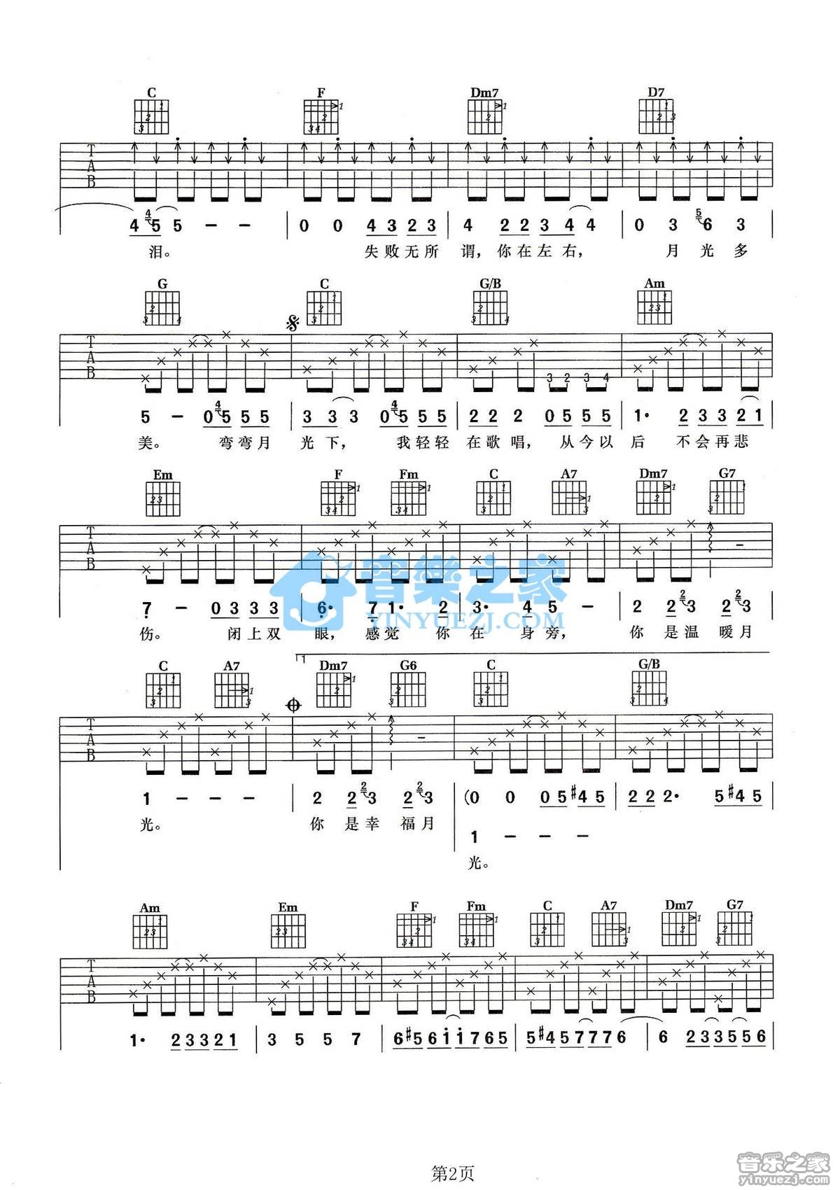 王心凌《月光》吉他谱,共有3张高清图谱。C调版王心凌《月光》吉他弹唱六线谱