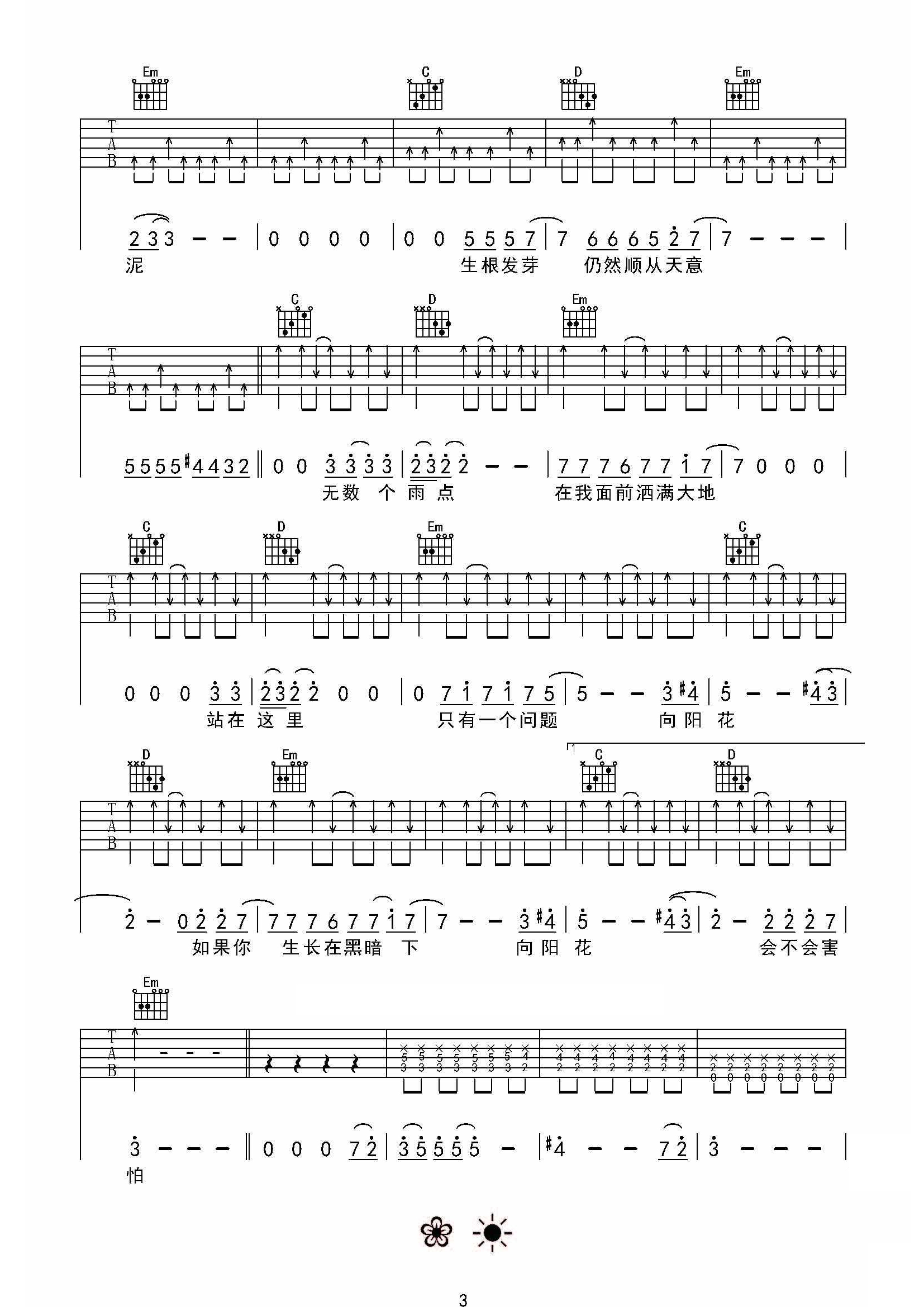 谢天笑《向阳花》吉他谱,绿岛琴行吉他教室张铁东编配出品,共有4张高清图谱。谢天笑向阳花吉他谱,C调指法,高清版六线谱编配,向阳花吉他弹唱谱。谢天笑的向阳花真是经典,唱出那个时代的原罪与追寻,迷茫与蓬勃。现代社会有很多人都处在徘徊煎熬中,这歌送给身处纠结的人们,继续努力,胜利就在不远处,让心中的向阳花指明方向。