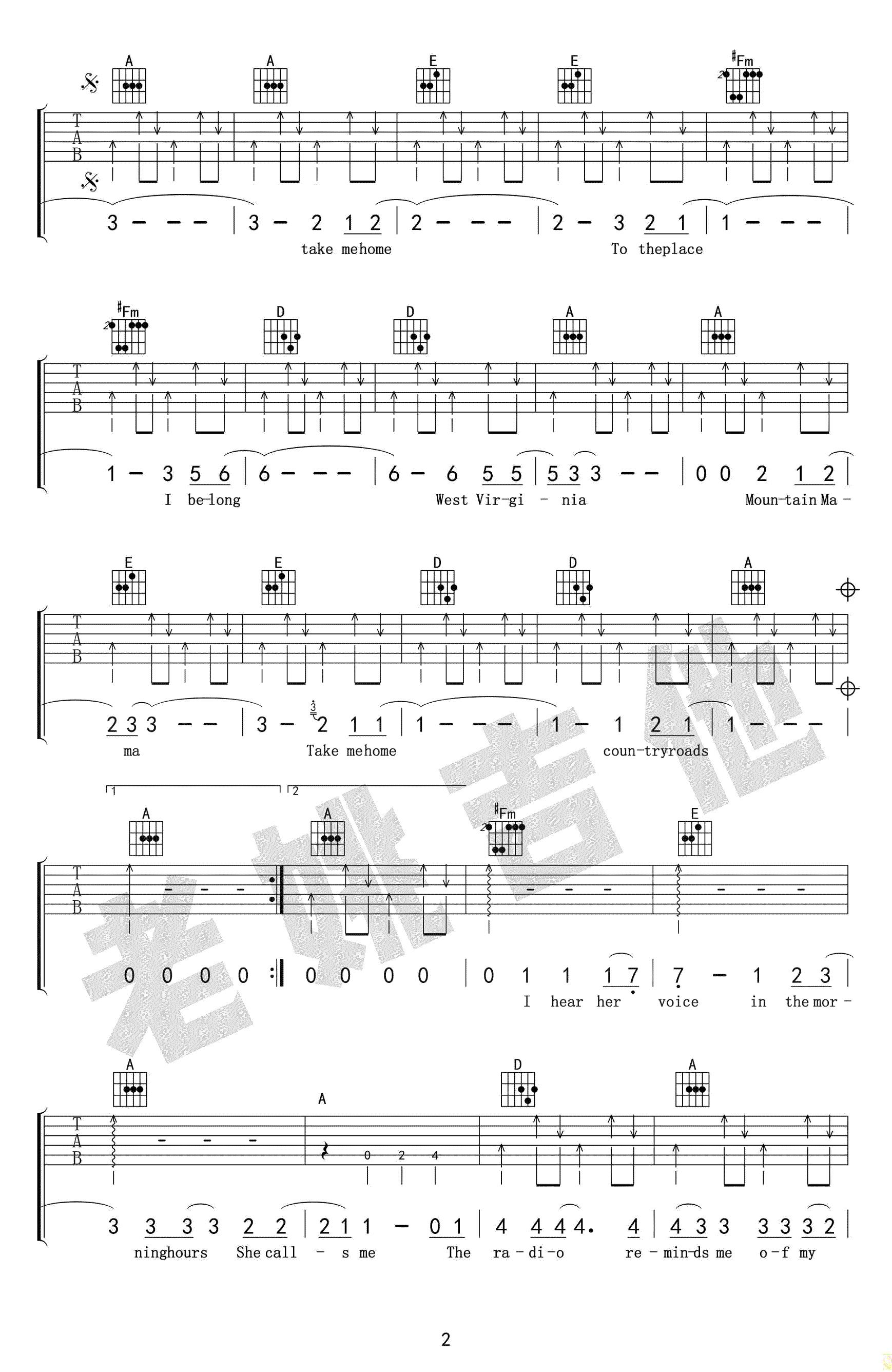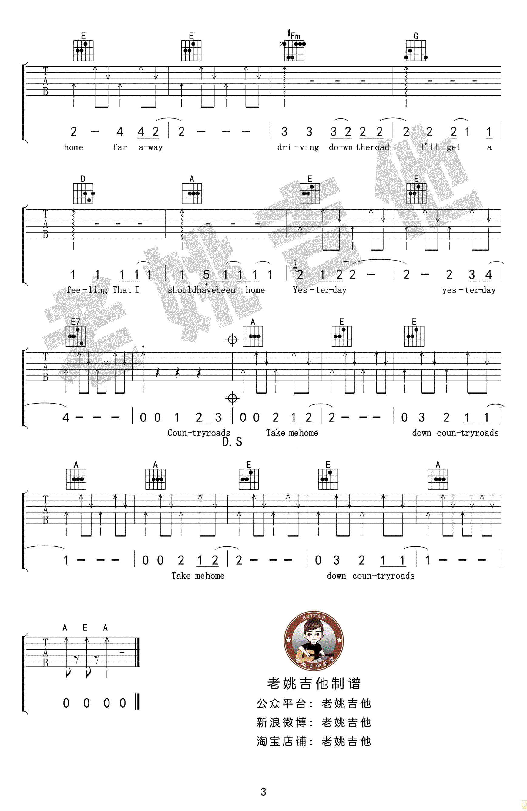 JohnDenver《Take me home country roads》吉他谱,老姚吉他编配出品,共有3张高清图谱。Takemehomecountryroads吉他谱,约翰丹佛演唱的一首经典英文歌曲,乡村路带我回家吉他谱,A调指法编配,随谱附上配套吉他弹唱教学视频。JohnDenver创作并演唱的著名乡村歌曲,听不厌的旋律,吉他的伴奏每个音符都刚刚好。故乡是每个人对内心的渴望与寄托,回家的路显得那么悠长。