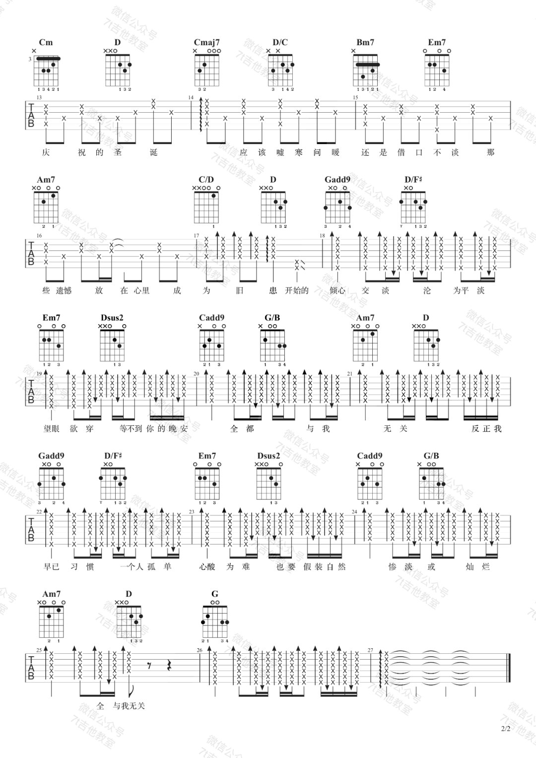 阿冗《与我无关》吉他谱,7t吉他编配出品,共有2张高清图谱,免翻页排版设计。《与我无关》吉他谱的原调是Bb大调,视频演示中的是G大调的指法来编配,标准音调弦,变调夹夹在2品,适合音域较低的男生。想唱原调的小伙伴夹3品就可以了哟。右手节奏型方面大家可以自由发挥,因为很多节奏型都能把同一首歌弹的很好听,不必完全按照谱子上的来弹哟~尤其是初学者如果觉得谱子的节奏型太难,完全可以用最基础的节奏型来代替!阿冗总会带来那种让人激发心底勇气的旋律感,喜欢激昂的便宜不要错过哟~