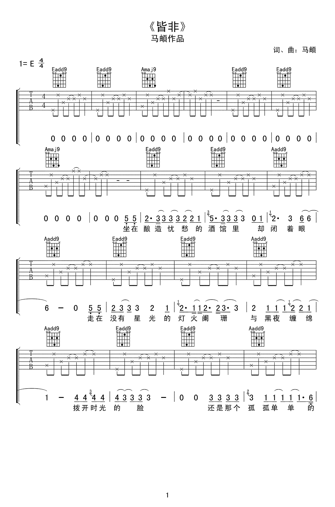 马頔《皆非》吉他谱,共有5张高清图谱。《皆非》吉他谱,E调弹唱谱,马頔在2016年推出的一首好听的民谣歌曲。越来越发现其实没人真正知道自己想要什么,只是发现了越来越不想要的。是啊,物事皆非,一根烟,一杯酒,一个人一座城,谁来谁去,都随风而去。