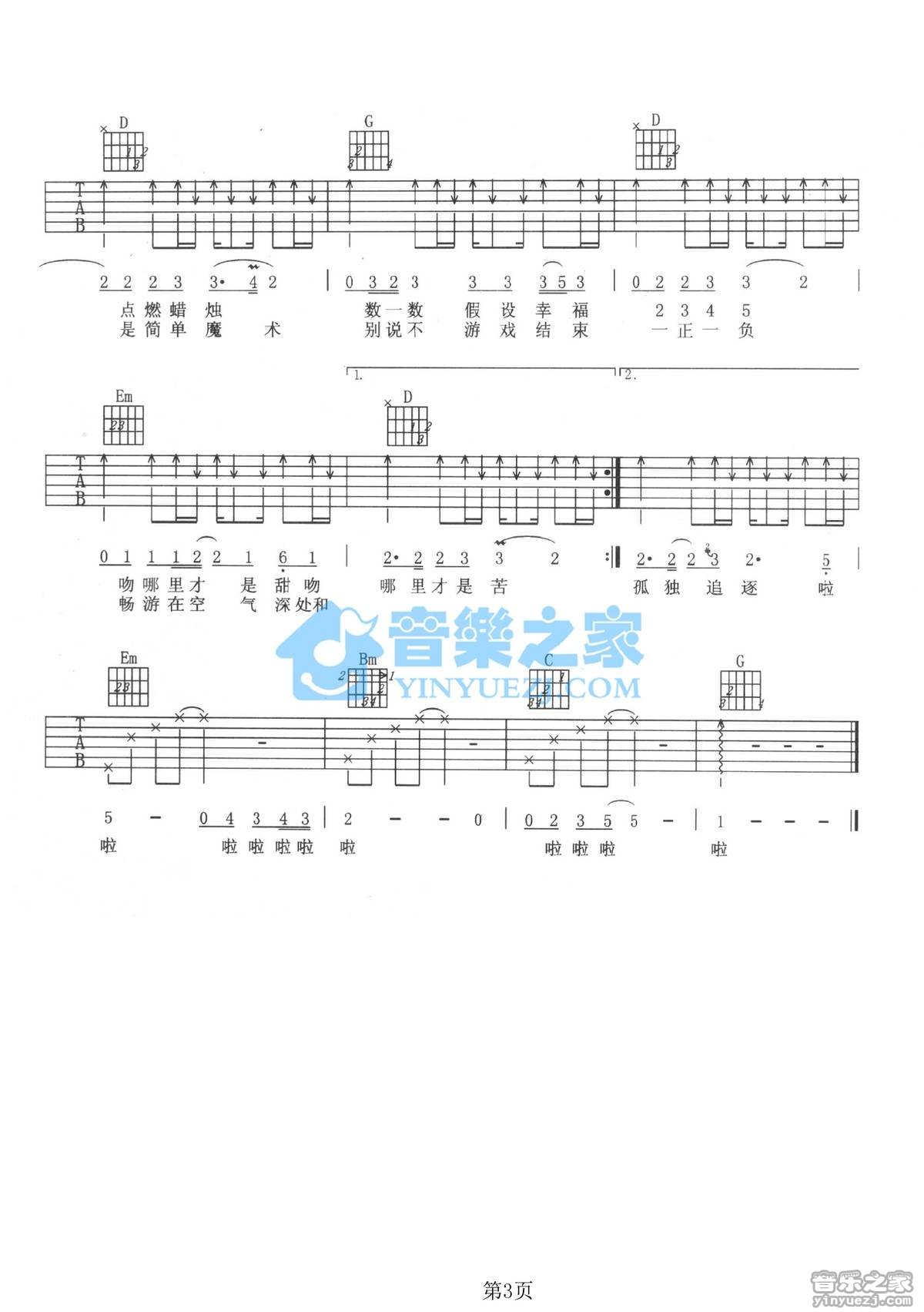 纪如璟《寂寞的自由》吉他谱,共有3张高清图谱。G调版纪如璟《寂寞的自由》吉他弹唱六线谱
