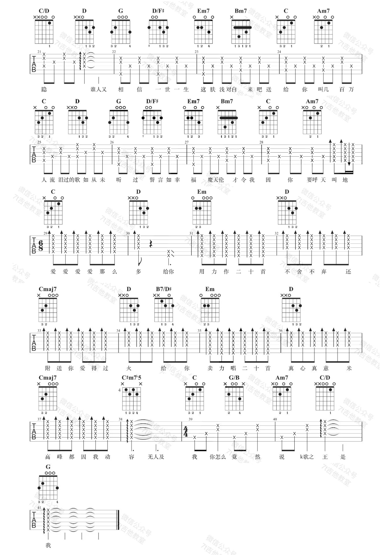 陈奕迅《K歌之王》吉他谱,7t吉他编配出品,共有2张高清图谱,免翻页排版设计。这首歌的原调是D大调,我用的是G大调的指法来编配,视频里是标准音调弦,使用变调夹,夹在第2品,适合音域较低的男生~想唱原调的童鞋需要标准音调弦,使用变调夹,夹在第7品哦!当然,不太建议用这个谱子弹原调,毕竟夹太多不好……