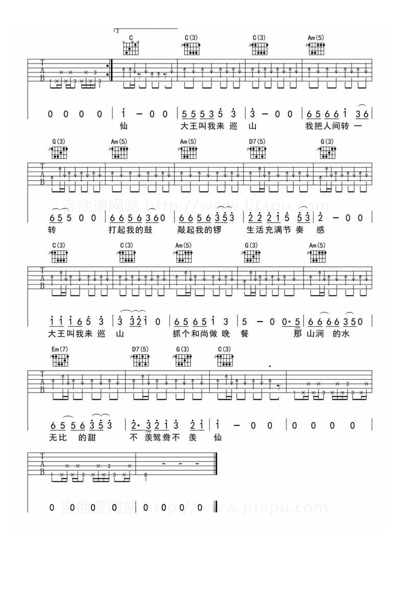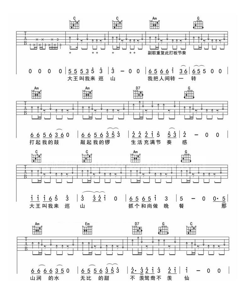 贾乃亮和甜馨《大王叫我来巡山》吉他谱,果木浪子编配出品,共有3张高清图谱。大王叫我来巡山吉他谱,C调指法编配,打板版本。这首欢乐的歌曲是网络剧《万万没想到》主题插曲,尤其是贾乃亮和甜馨演唱版本,朗朗上口的歌词和搞笑的音乐风格,得到大家的喜爱,成为新一代的洗脑神曲。