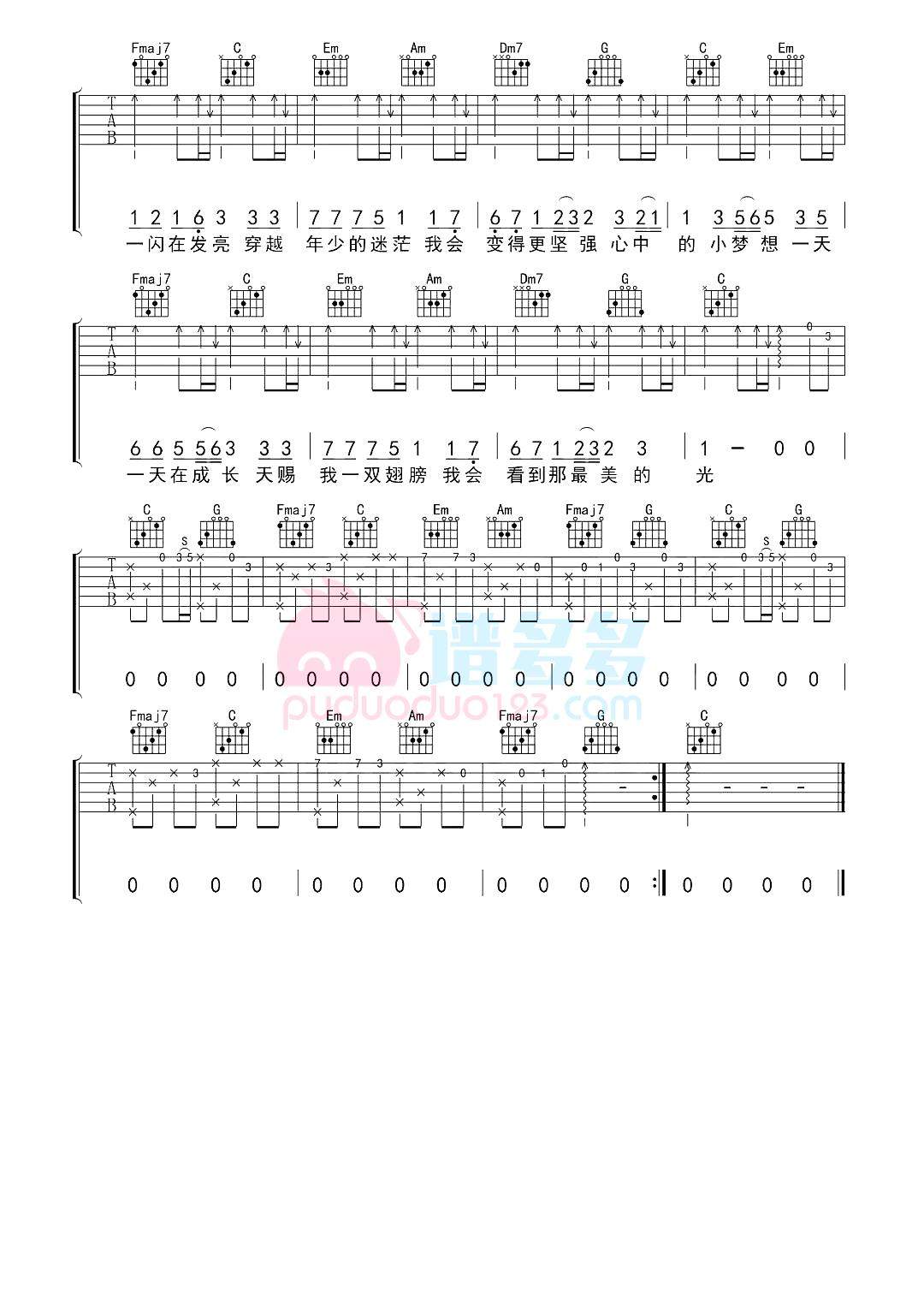 尚琪琪《最美的光》吉他谱,共有2张高清图谱,免翻页排版设计。2011尚琪祺携手新锐音乐唱作人任浩铭全球推出的首支单曲,尚琪祺清新亮丽的嗓音很好听,歌词很励志,告诉我们不要轻言放弃。 这首歌是内地新锐歌手任浩铭2011年所创作的儿童励志歌曲,由小童星尚琪祺演唱,也是她荧屏之外的首支音乐处女作,这是一首励志歌曲,告诉我们不要轻言放弃。