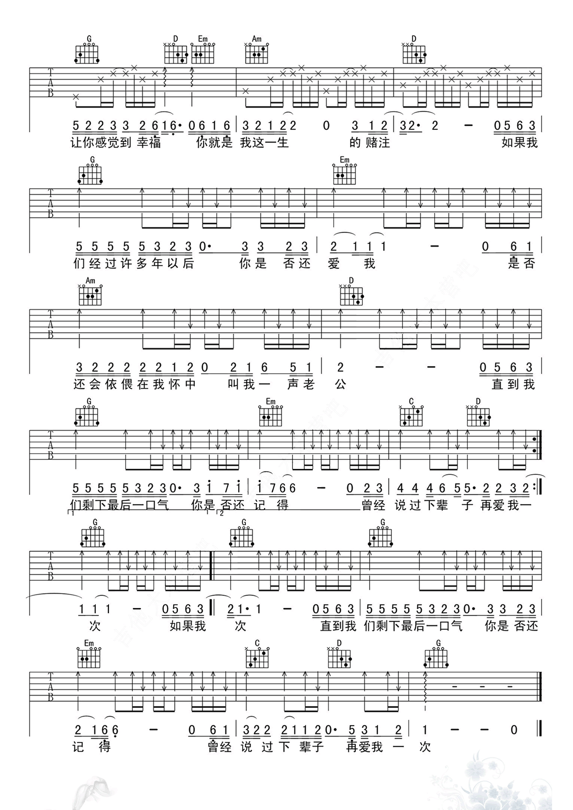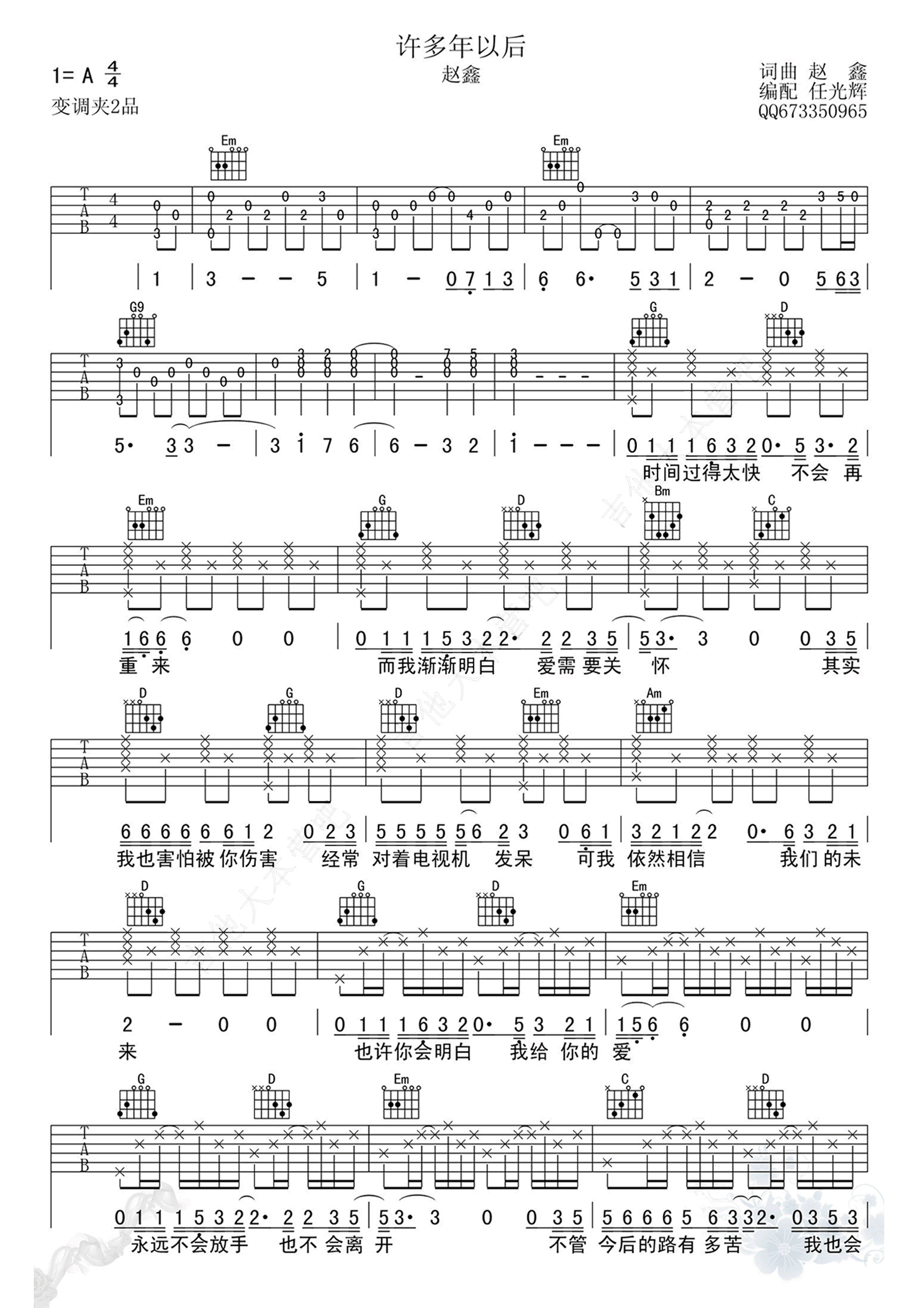 赵鑫《许多年以后》吉他谱,共有2张高清图谱,免翻页排版设计。变调夹夹第二品。许多年以后,是否还记得曾经爱着的那个人?是否还记得当初的自己?我在这里,你在哪里?爱一首歌,常常是因为某句歌词,但真正动人的不是那句歌词,而是在你生命中那些关于这首歌的故事。