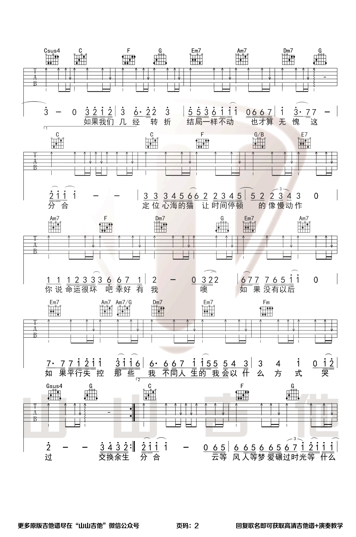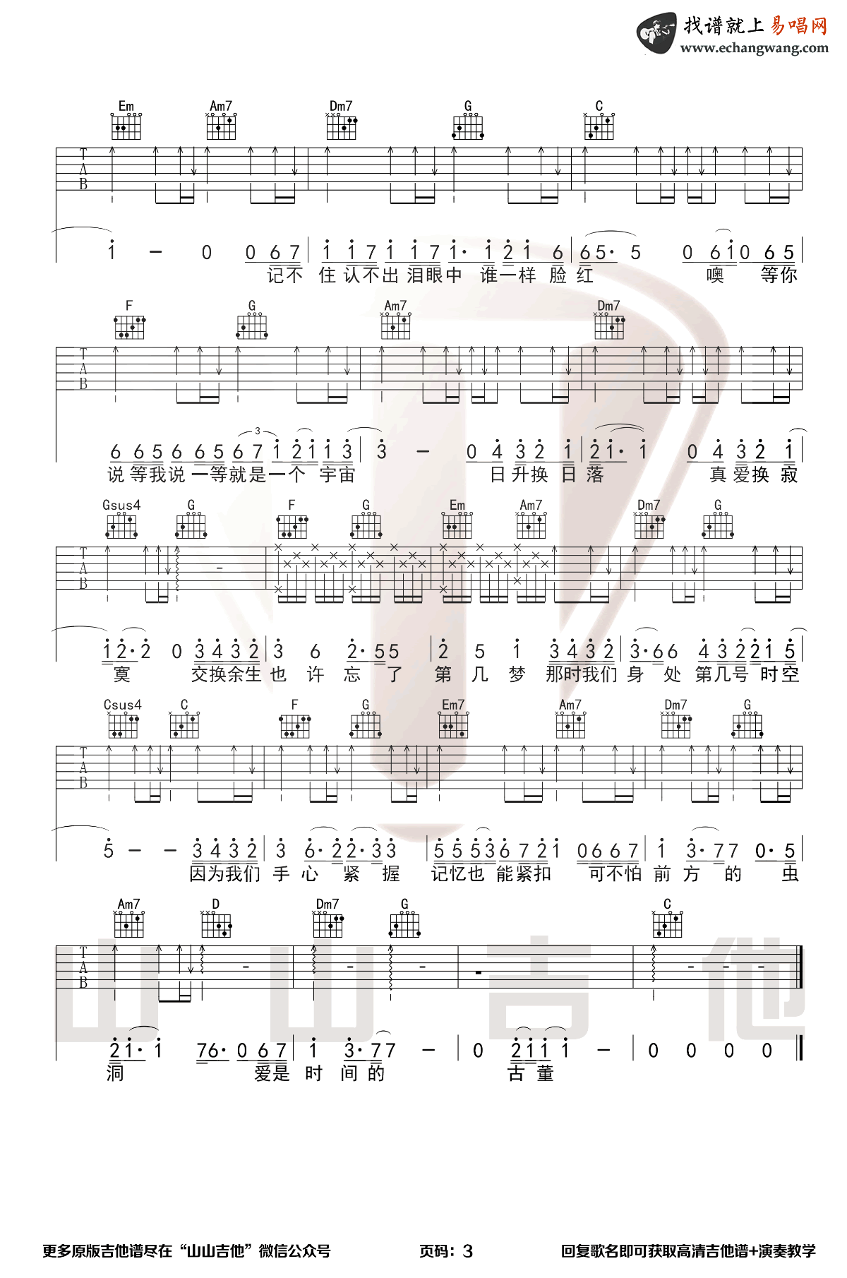 林俊杰《交换余生》吉他谱,山山吉他编配出品,共有3张高清图谱。林俊杰《交换余生》吉他谱_C调吉他弹唱谱