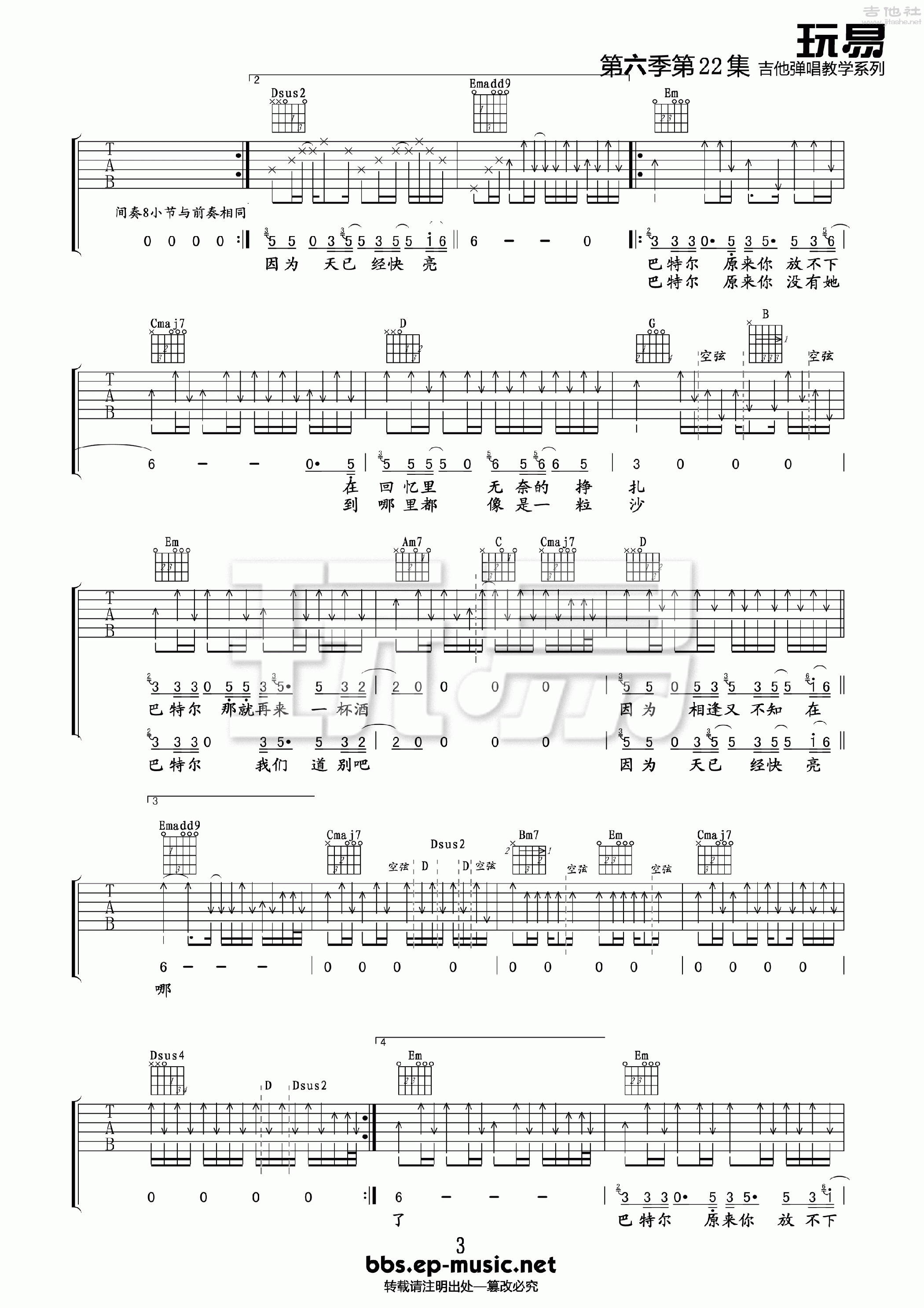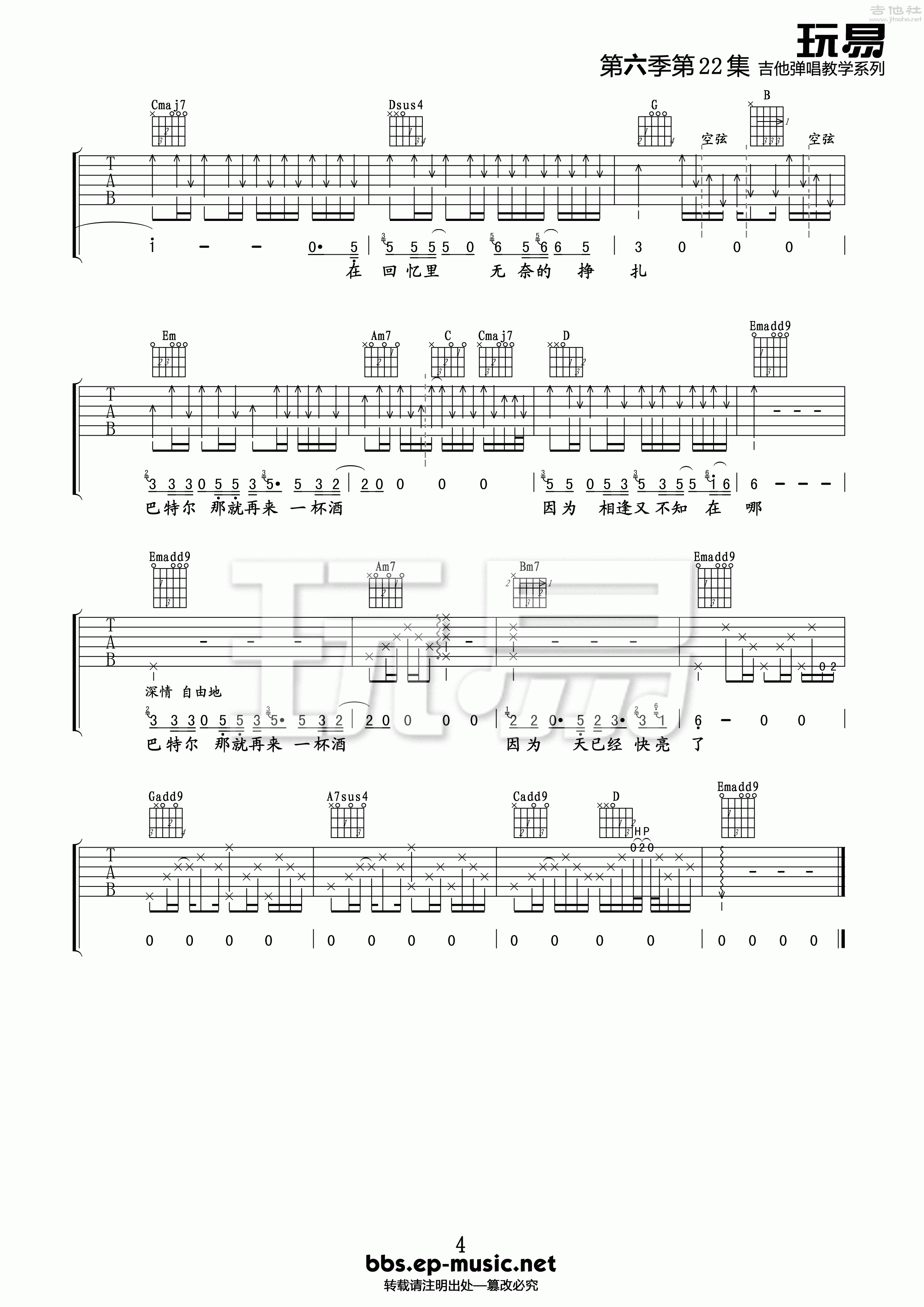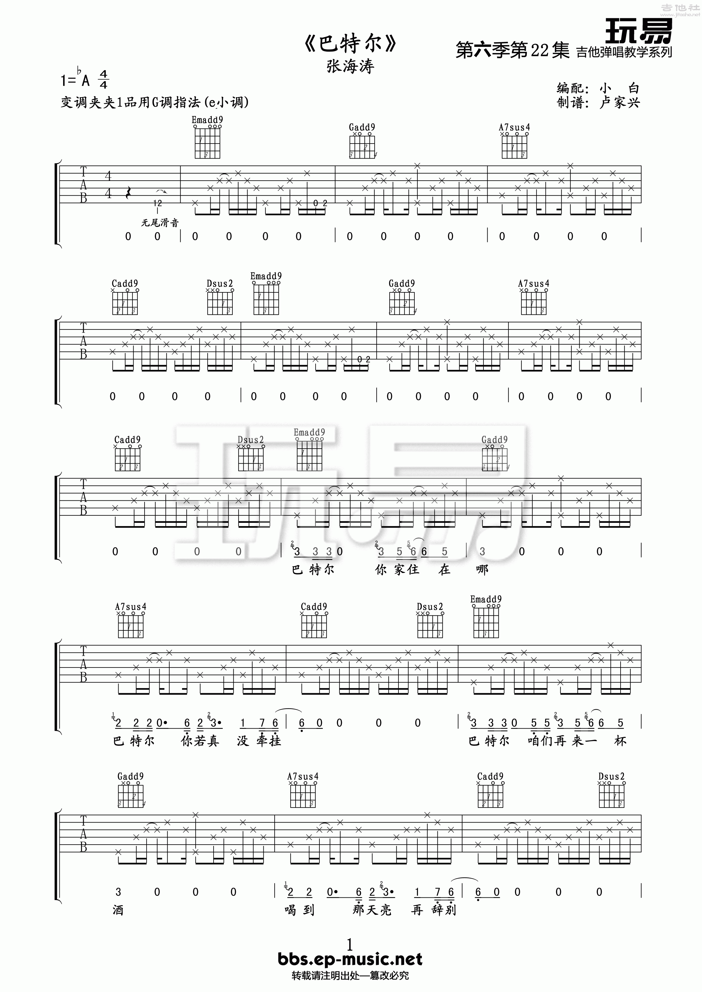 张海涛《巴特尔》吉他谱,玩易编配出品,共有4张高清图谱。