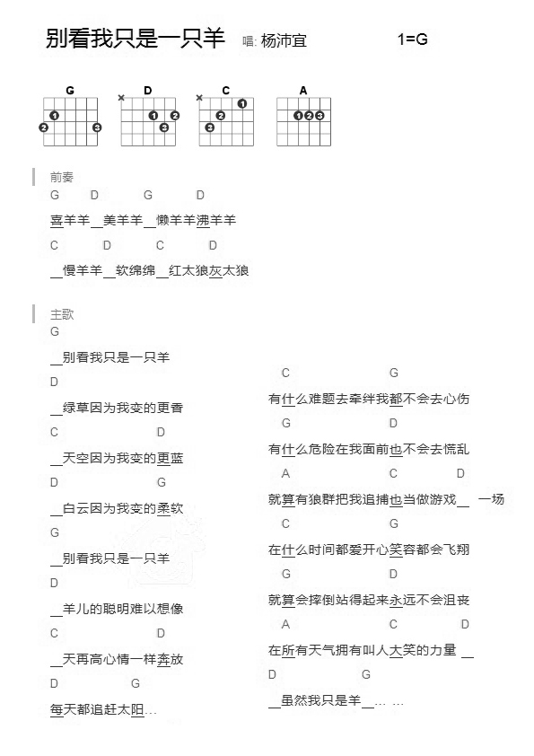 杨沛宜《别看我只是一只羊》吉他谱,YYZJ编配出品,共有1张高清图谱,免翻页排版设计。