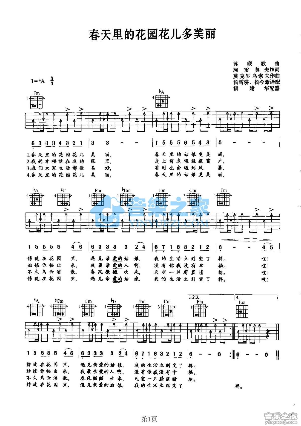苏联歌曲《春天里的花园花儿多美丽》吉他谱,YYZJ编配出品,共有1张高清图谱,免翻页排版设计。bA调版《春天里的花园花儿多美丽》吉他弹唱六线谱