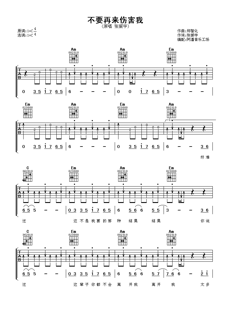 张振宇《不要再来伤害我》吉他谱,共有3张高清图谱。张振宇《不要再来伤害我》吉他谱_C调吉他弹唱谱