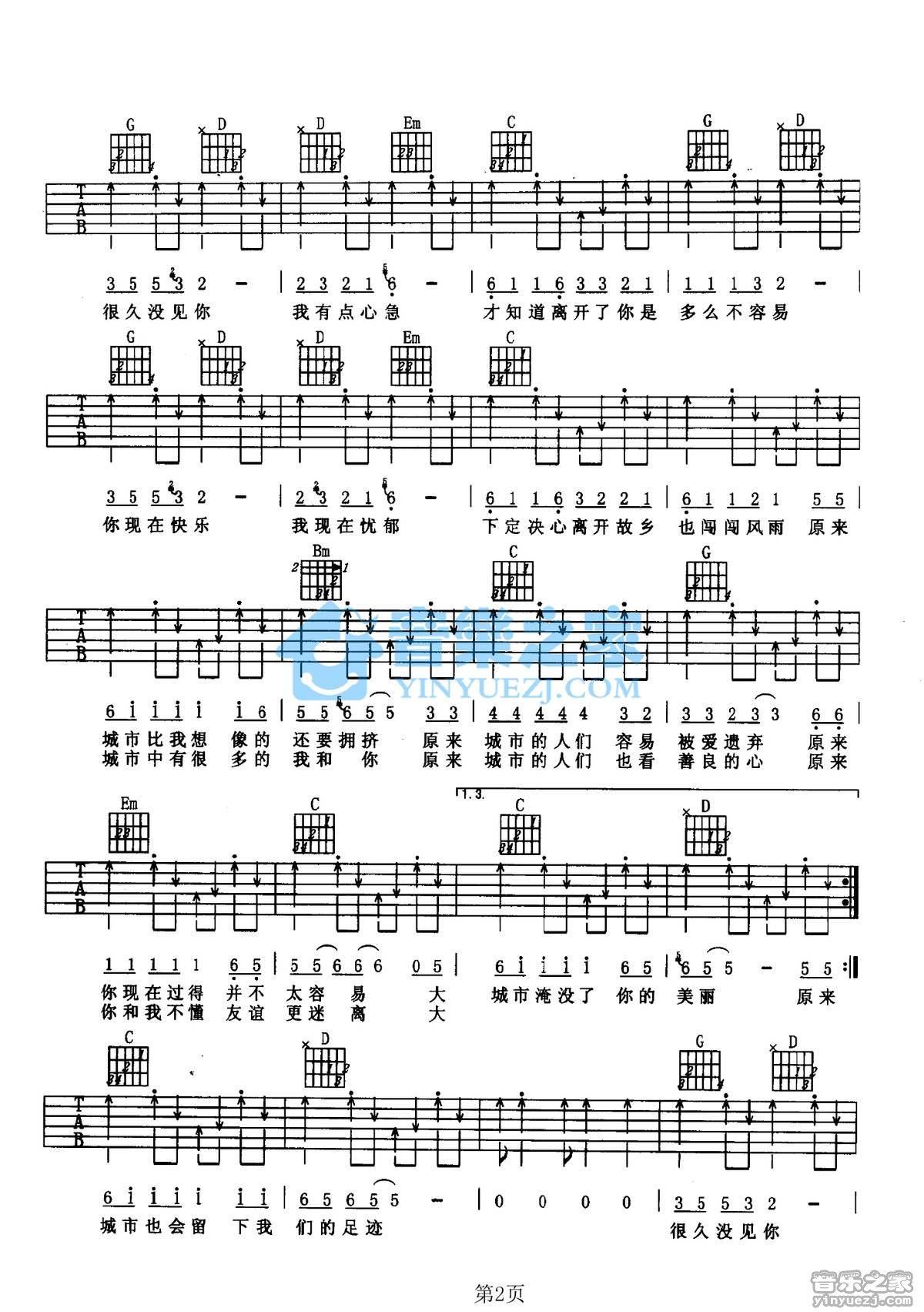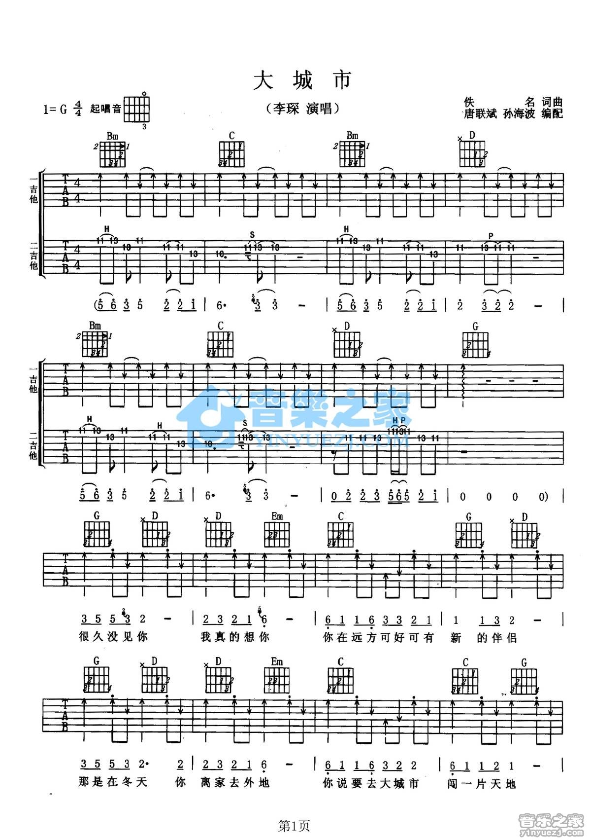 李琛《大城市》吉他谱,共有3张高清图谱。G调双吉他版李琛《大城市》吉他弹唱六线谱