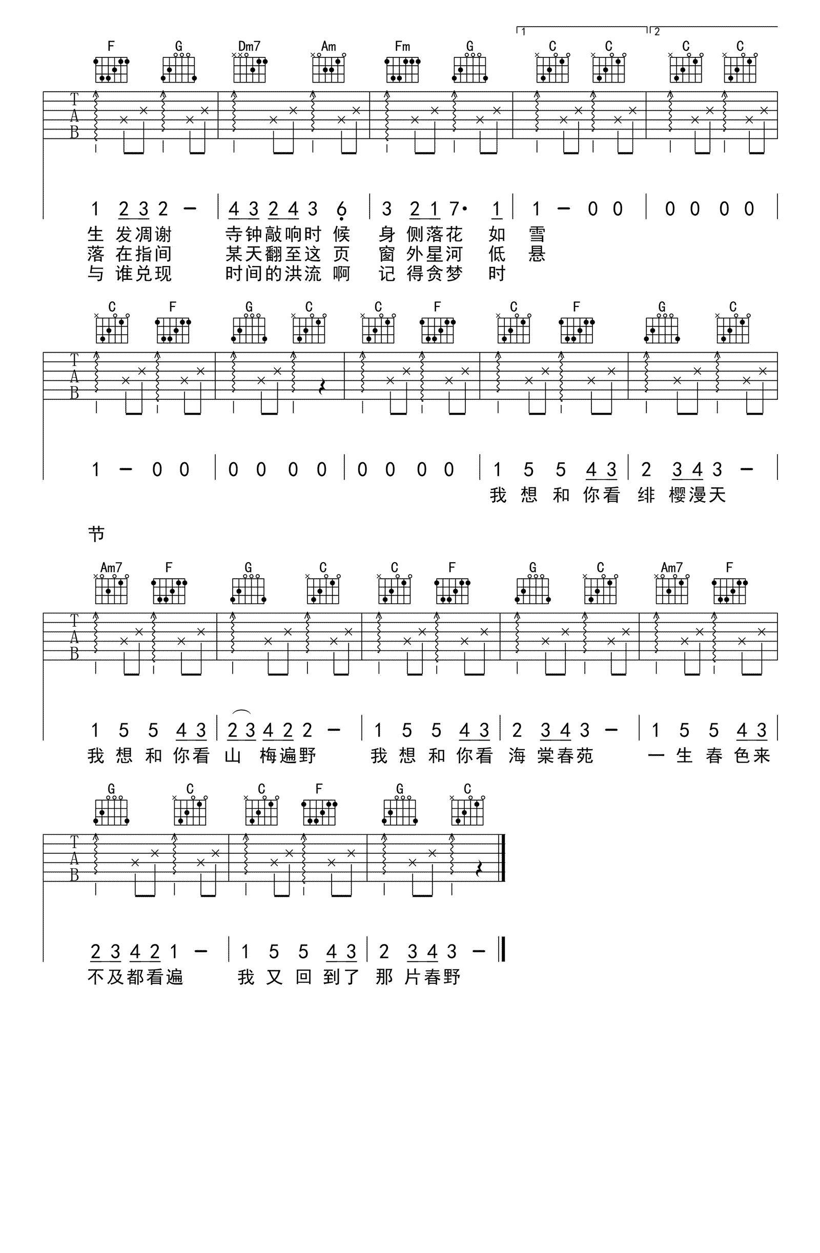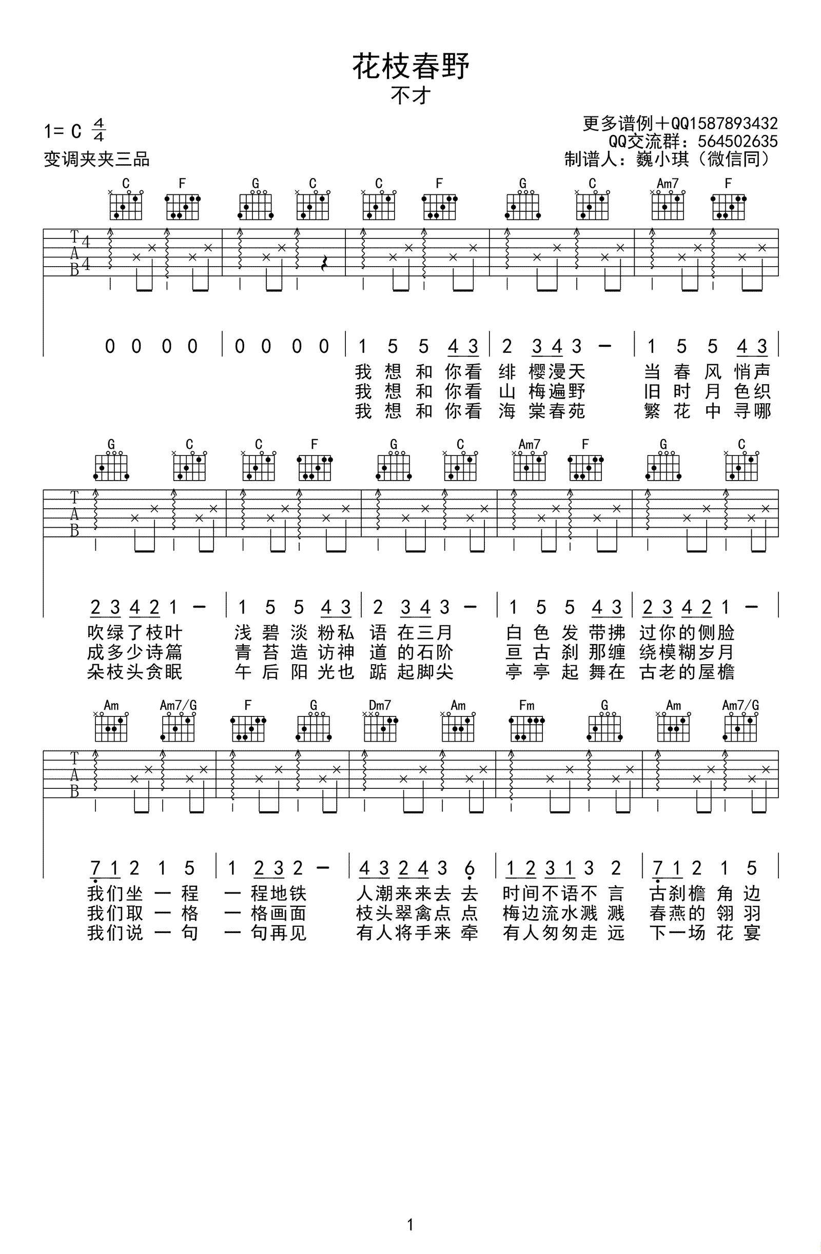 不才《花枝春野》吉他谱,巍小琪编配出品,共有2张高清图谱,免翻页排版设计。不才《花枝春野》吉他谱,C调高清弹唱谱,变调夹夹三品,古风歌手不才演唱商连作词一首治愈歌曲,改编自手嶌葵的原版《金色原野》,初春的绯樱漫天和一枝新桃掩映的古刹檐角,盛夏的冰镇啤酒和三年结束晚修时单车后座,立秋的河畔晚风和八月木樨树下有炒栗子香,暮冬的红泥火炉和两句情话就能骗得烤红薯……