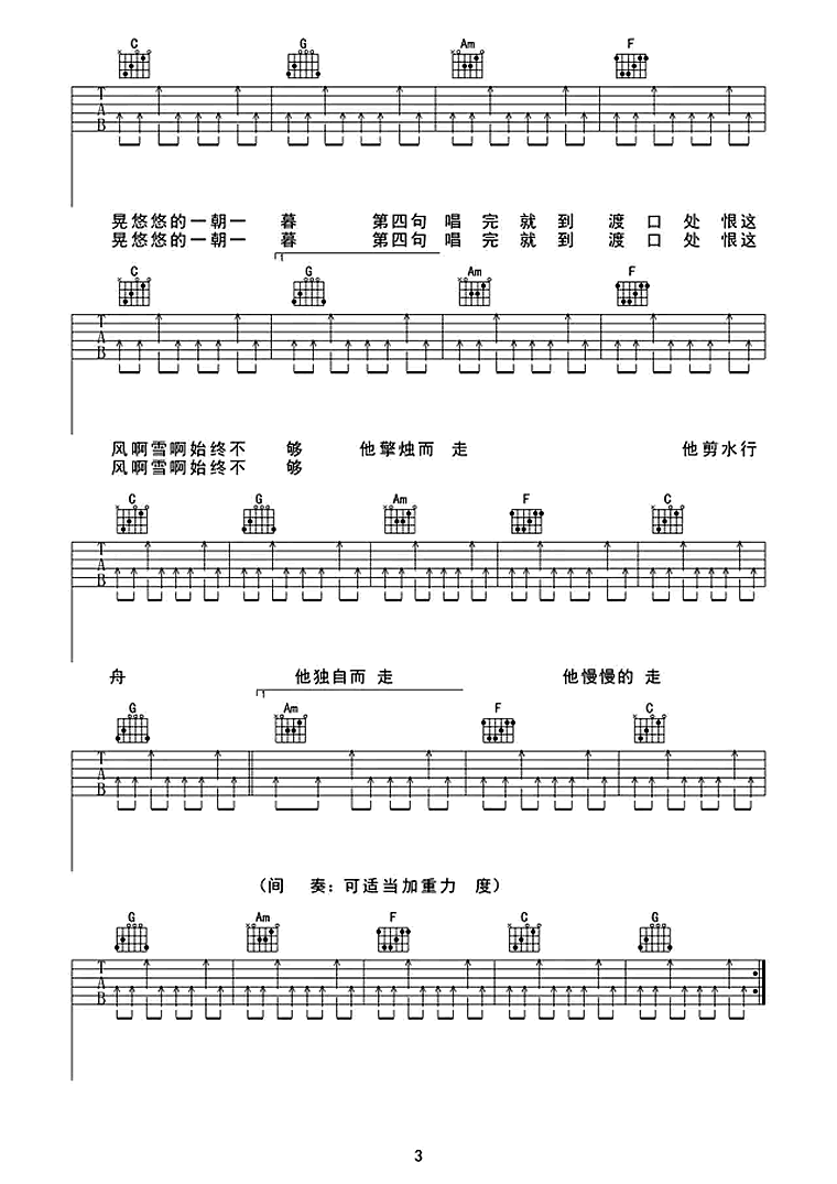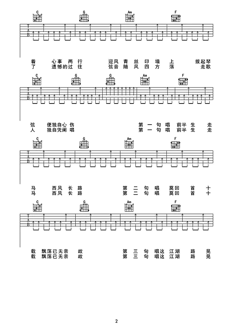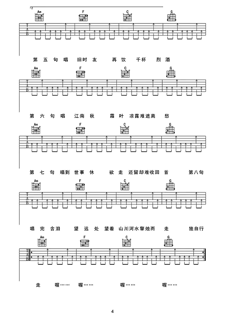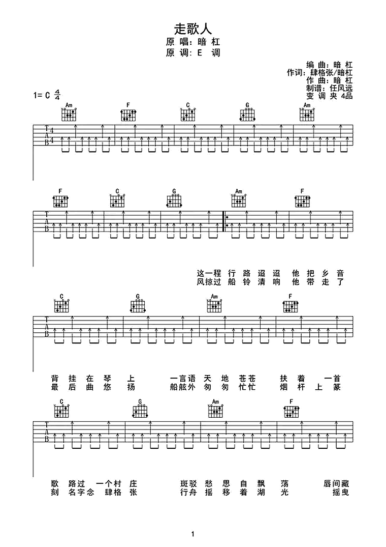 暗杠《走歌人》吉他谱,任风远编配出品,共有4张高清图谱。走歌人吉他谱,原调E,斗鱼主播独立音乐人杠姐,一把吉他可敌千军万马的江湖走歌人,这一程行路迢迢,我把乡音背挂在琴上。《走歌人》吉他弹唱谱。斑驳愁思自飘荡,唇间藏着心事两行。迎风青丝印墙上,拨起弦便独自心伤。行舟摇移着湖光,摇移了遗憾的过往,弦音随风四方荡,走歌人独自凭阑唱。