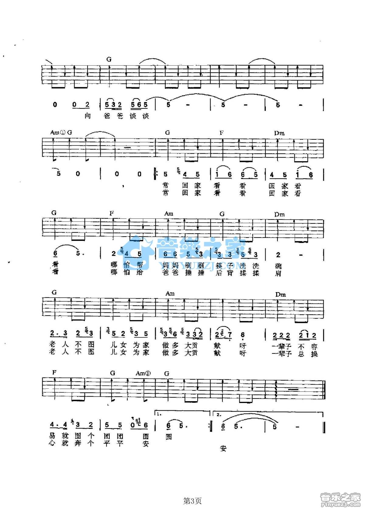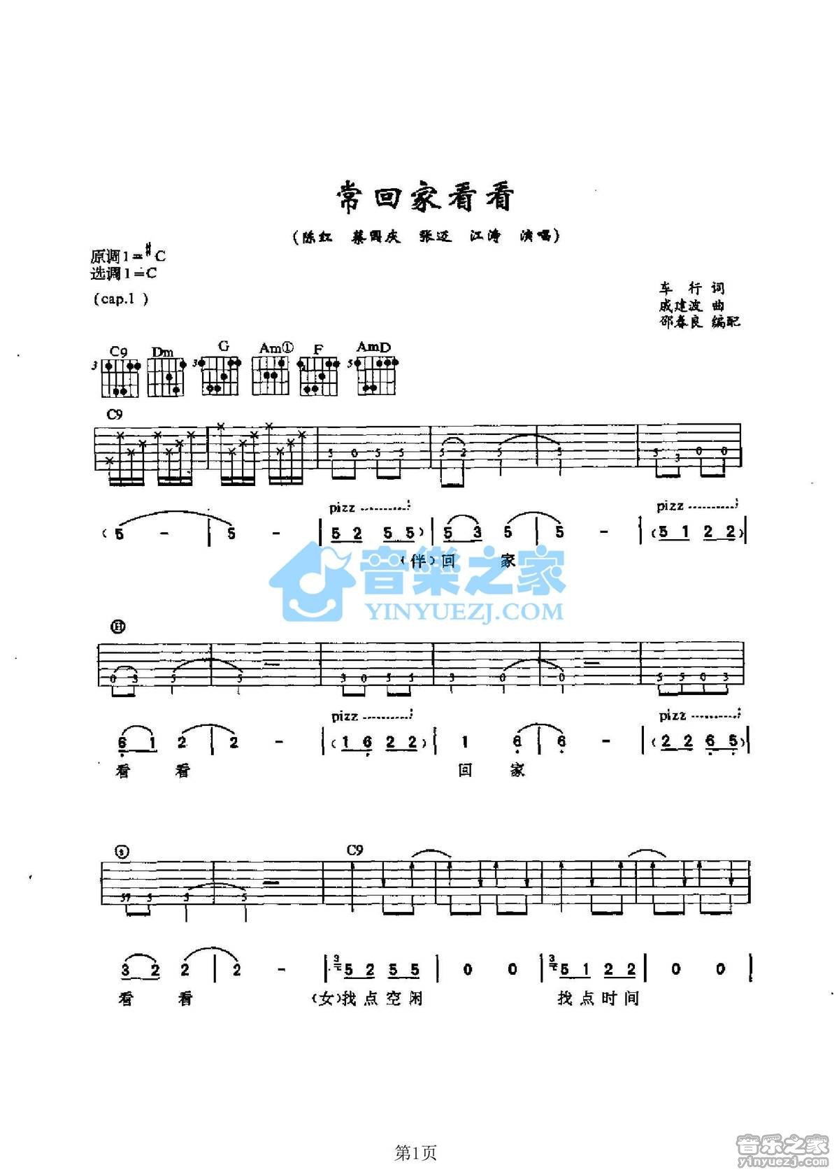 陈红《常回家看看》吉他谱,共有3张高清图谱。C调版 陈红《常回家看看》吉他弹唱六线谱