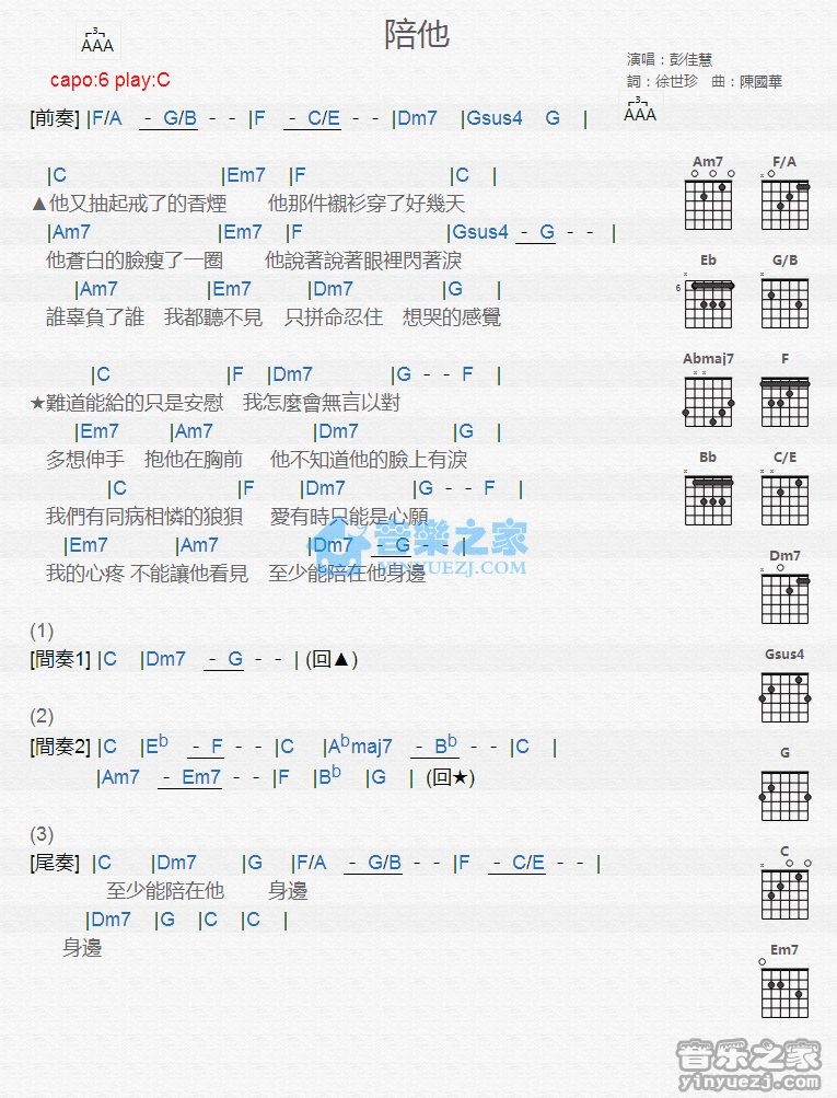 彭佳慧《陪他》吉他谱,共有1张高清图谱,免翻页排版设计。C调版 彭佳慧《陪他》吉他和弦弹唱谱