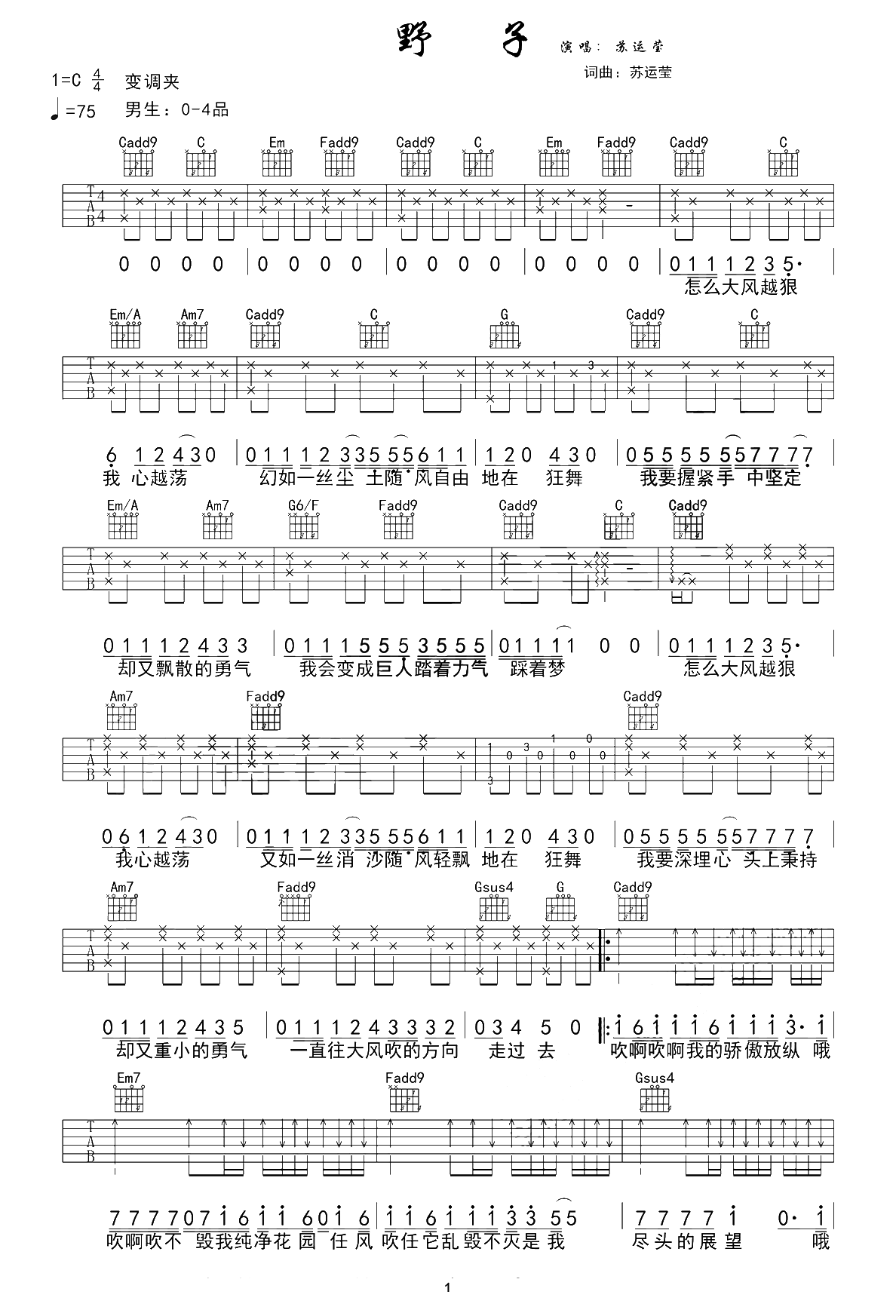 苏运莹《野子》吉他谱,小伟编配出品,共有2张高清图谱,免翻页排版设计。野子吉他谱,中国好歌曲苏运莹的原创歌曲,野子吉他弹唱谱,本曲谱为C调指法,男生可以根据自己音域选择变调夹,整首歌曲根据原版编配,伴奏音型完美呈现,节奏型比较简单,