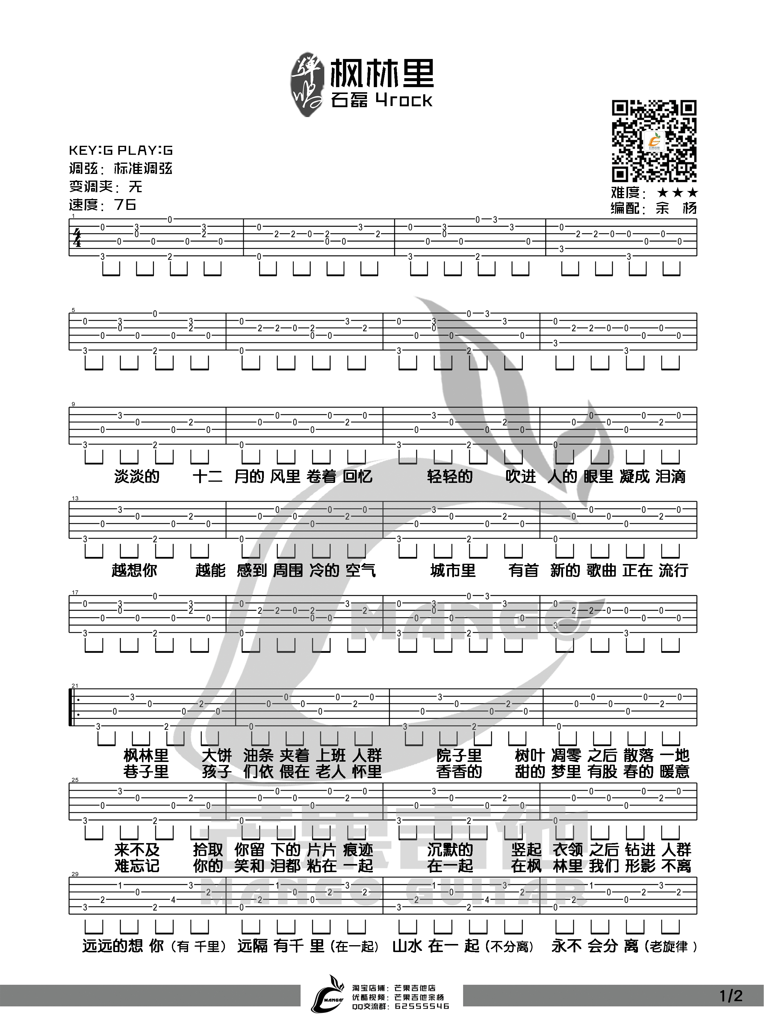 石磊《枫林里》吉他谱,芒果编配出品,共有2张高清图谱,免翻页排版设计。
