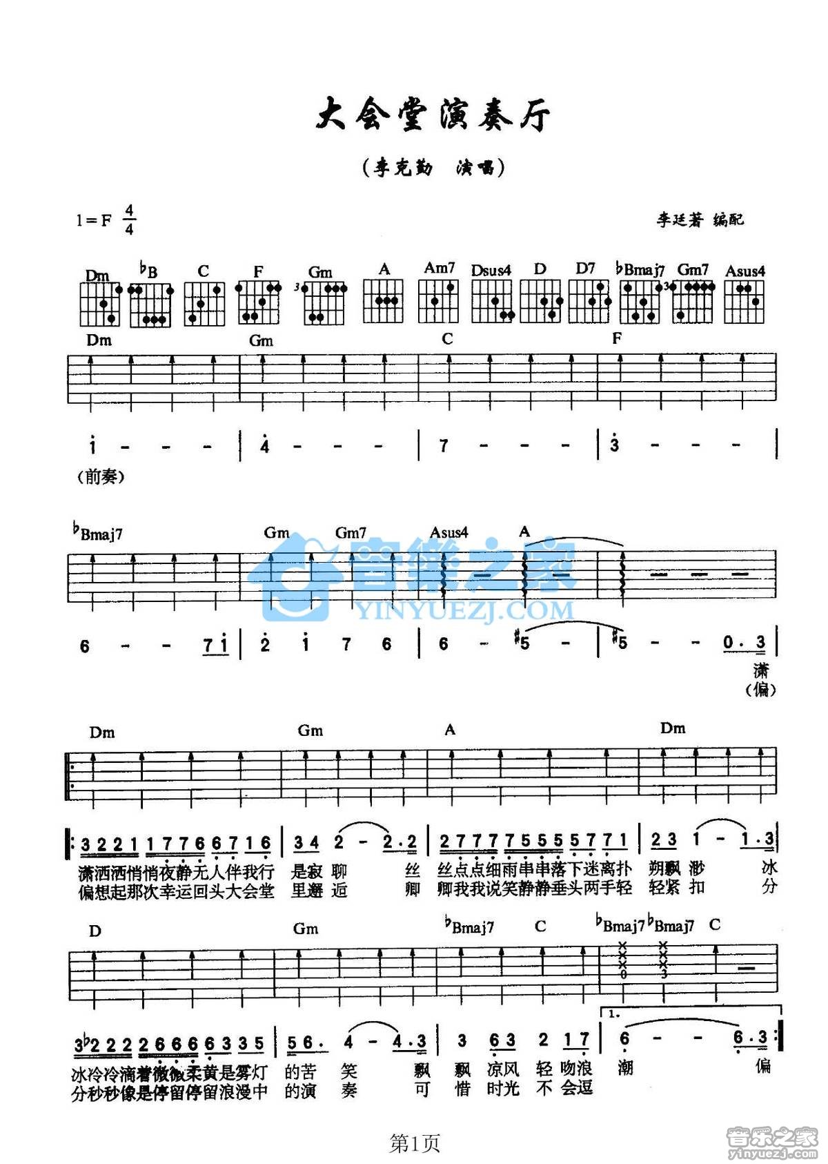 李克勤《大会堂演奏厅》吉他谱,共有2张高清图谱,免翻页排版设计。F调版李克勤《大会堂演奏厅》吉他弹唱六线谱